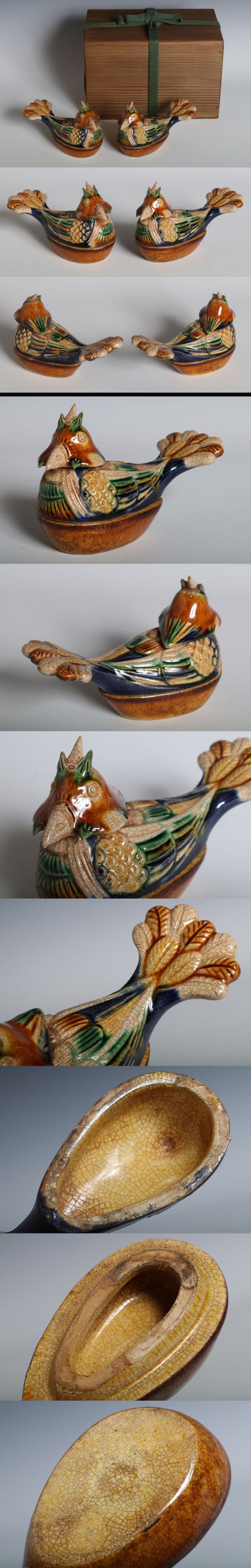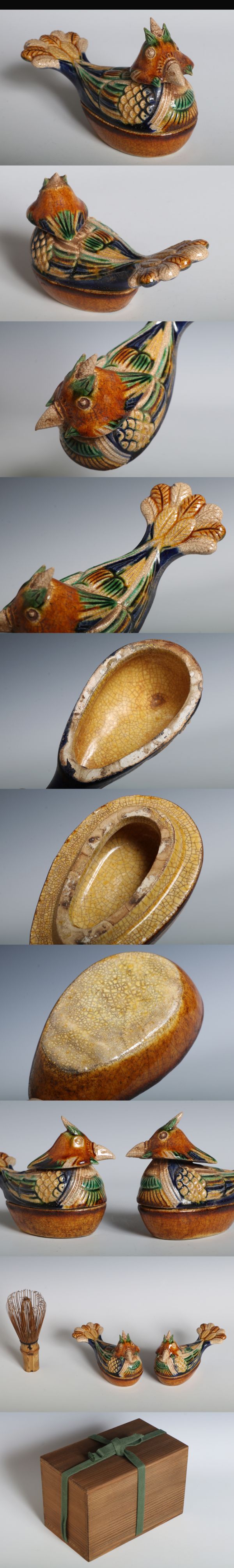 N26188 中国陶器 三彩鳳凰形双香合(木箱) 一対 蓋盒式香薰 香合 茶道具 香道具 検:唐三彩 三彩 中国 古玩 唐物