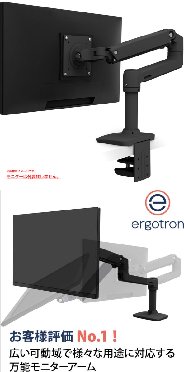 【商品特長】 ●可動範囲が広い多用途向け万能モニターアームです。 使用しないときはコンパクトに折りたため、作業スペースを広く使えます。 ●特許取得済みコンスタント・フォース技術により、軽く触れるだけでモニターの位置調節が可能です。 ガススプリング式のような経年劣化がありません。 ●昇降機能は10,000回ものサイクルテストが実施されており、 長年に渡りトラブル無く、スムーズに高さ調整が可能です。 ●デスククランプは60mmまでの厚さに取り付け可能。 ●グロメットマウントは直径8~50mmの穴、57mmまでの厚さに取り付け可能。 | |||||||||||||||||||||||