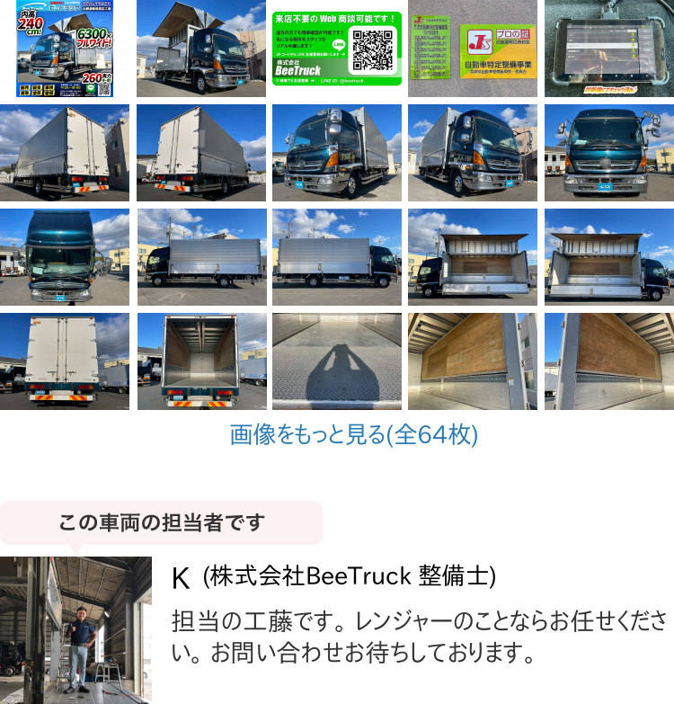 車両状態コメント車両の状態、気になる点に関しましてはお気軽にお問い合わせ下さい!現車確認、テスト走行、画像リクエスト、大歓迎です!https://bee-truck-sale.com/車両所在地〒679-4138 兵庫県たつの市誉田町下沖字久保39-1フリーダイヤル 0120-667-792一般 0791-72-8799営業時間 9:00~18:00(日祝除く)