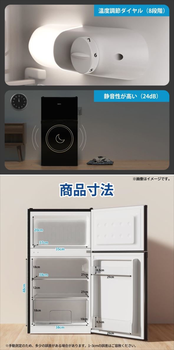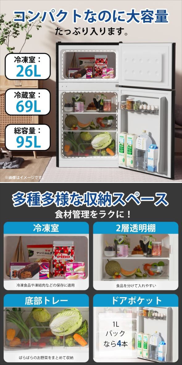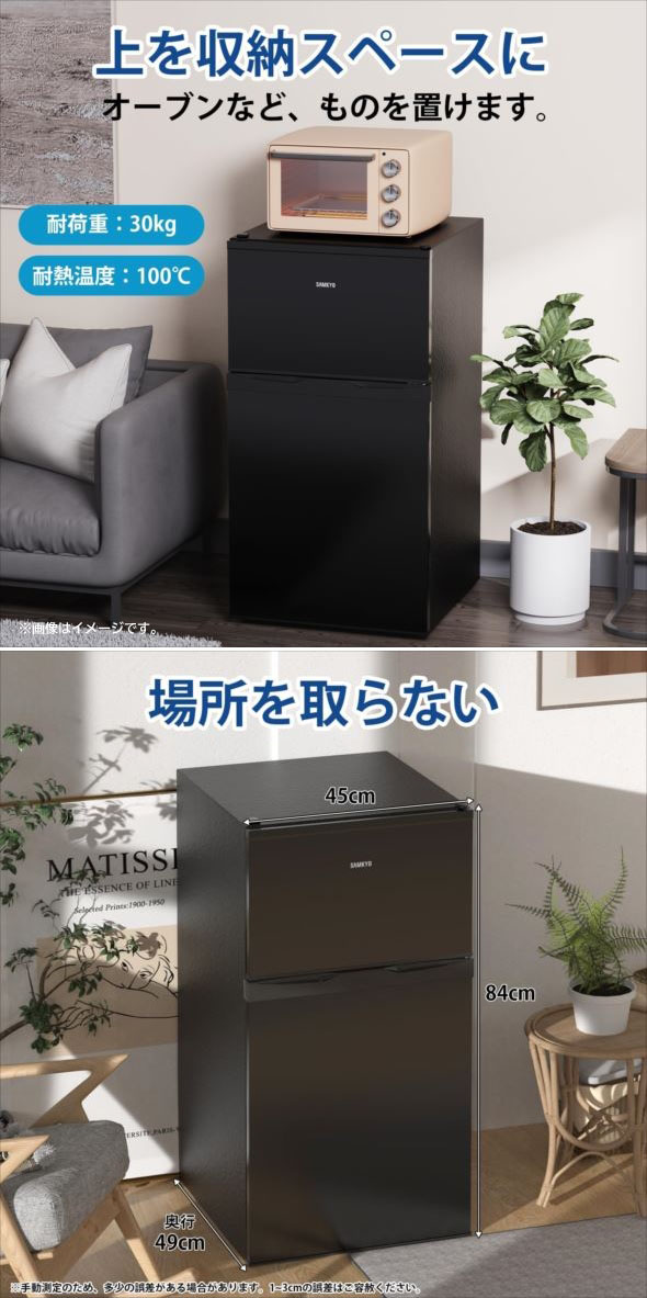【商品特長】 ●長さ49cm、幅45cm、高さ82.5cm、占地面積わずか0.56畳、総容量95L(冷凍室28L、冷蔵室67L)。 ●1~2人暮らし向け。 コンパクトなのにたっぷり入ります、様々な食材を簡単に収納できます。 ● 場所を取らない。キッチンや寝室、リビングを最大限に活用できます。 ●冷凍室: 主に冷凍食品や凍結肉、アイスクリームなどの保存に適しています。 食材の新鮮さを保ち、いつでも美味しいものを楽しむことができます。 ● 2層透明棚: 階層分けされ、缶詰やパッケージ入りの食品などを簡単に配置できます。 もはや食材が埋もれる心配はなく、必要なものが簡単に見つかります。 ●底部トレー: ばらばらのお野菜をまとめて収納できます。 ●ドアポケット: 牛乳、卵、飲み物などを簡単に整理できます。1Lバックなら4本、2Lペットボトルなら3本。 ●急速冷却技術により、食材が素早く理想的な温度に達します。暑い夏でも、食材の鮮度を簡単に保つことができます。 ●異なる季節やニーズに合わせて、簡単なダイヤル操作で7段階の温度調節が可能です。 ●耐熱温度100℃、耐荷重30kgで。冷蔵庫の上のスペースをより効果的に活用できます。 | |||||||||||||||||