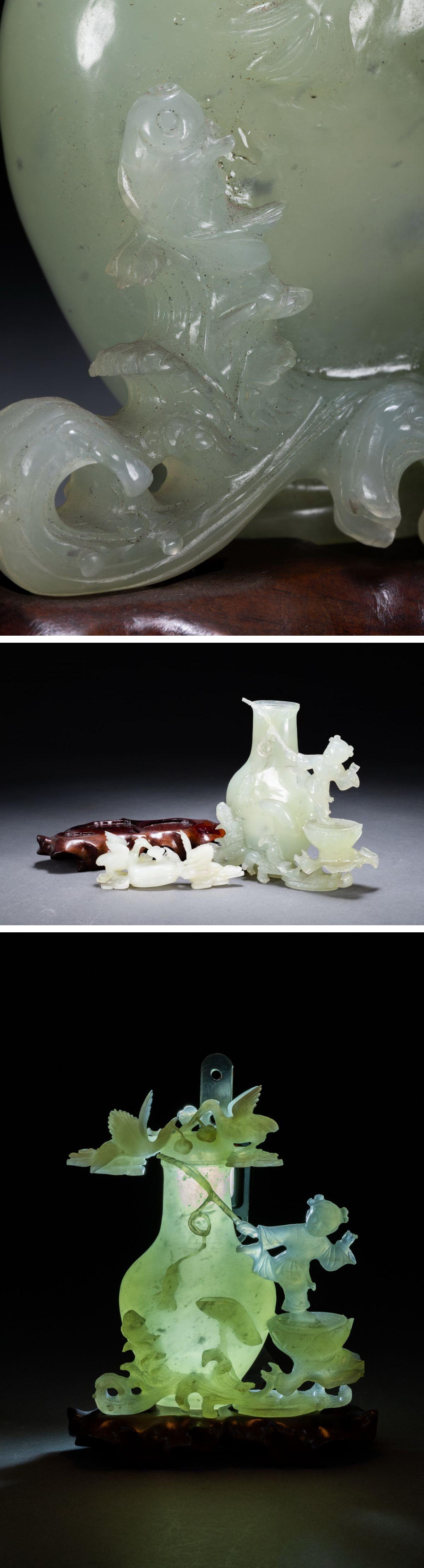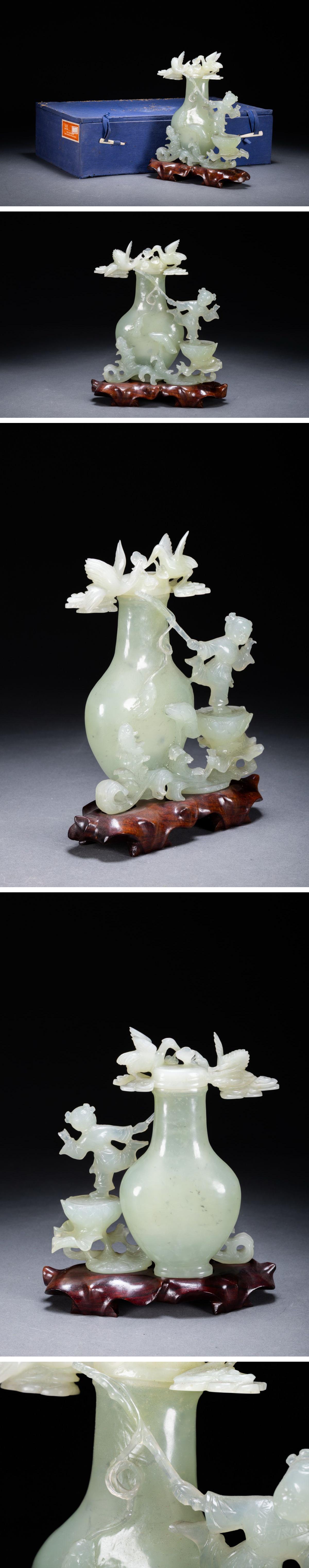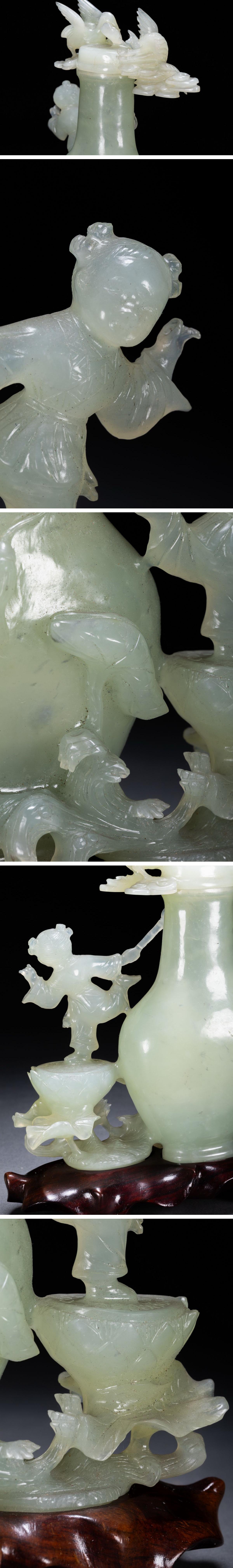 【雲錦】1円から 時代物 中国伝来 天然碧玉 唐子戯鵝文寶瓶 共箱 中国古美術 材質保証 時代物保証 古美術 骨董品8L1-117S1