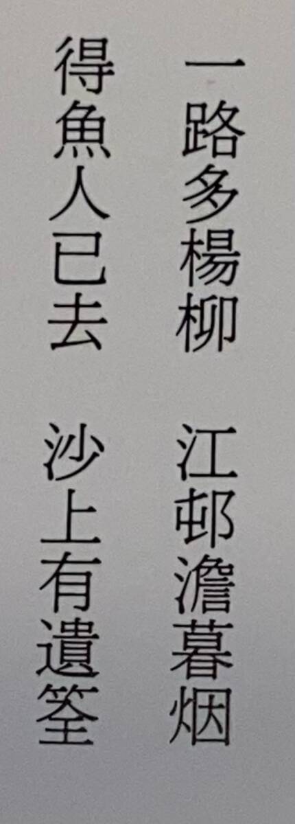 【サイズ】:表具が縦 199cm、横 49.5cm 本紙が縦 138cm、横 34cm 【本紙】:絖本。 【 箱 】:箱入り。 【状態】:染みあるも良好。 詩文を読むと、夕暮れ時しだれた柳が多く目立つ川添いにある村々には畑を焼く煙が立ち込め寒々とした空気に交じる 丘上の人が過ぎ去る漁師になにやら声をかけている・・これは漁礁問答をおえたとこでしょうか 建野公清さんにあてた作品。 荒涼とした風景に小さく紅い紅葉が残った初冬の夕暮れ時の風景。 厳しい本格的な冬将軍の到来を待つそんな一時の情景を切り取った作品。 五岳上人80歳の作。 |