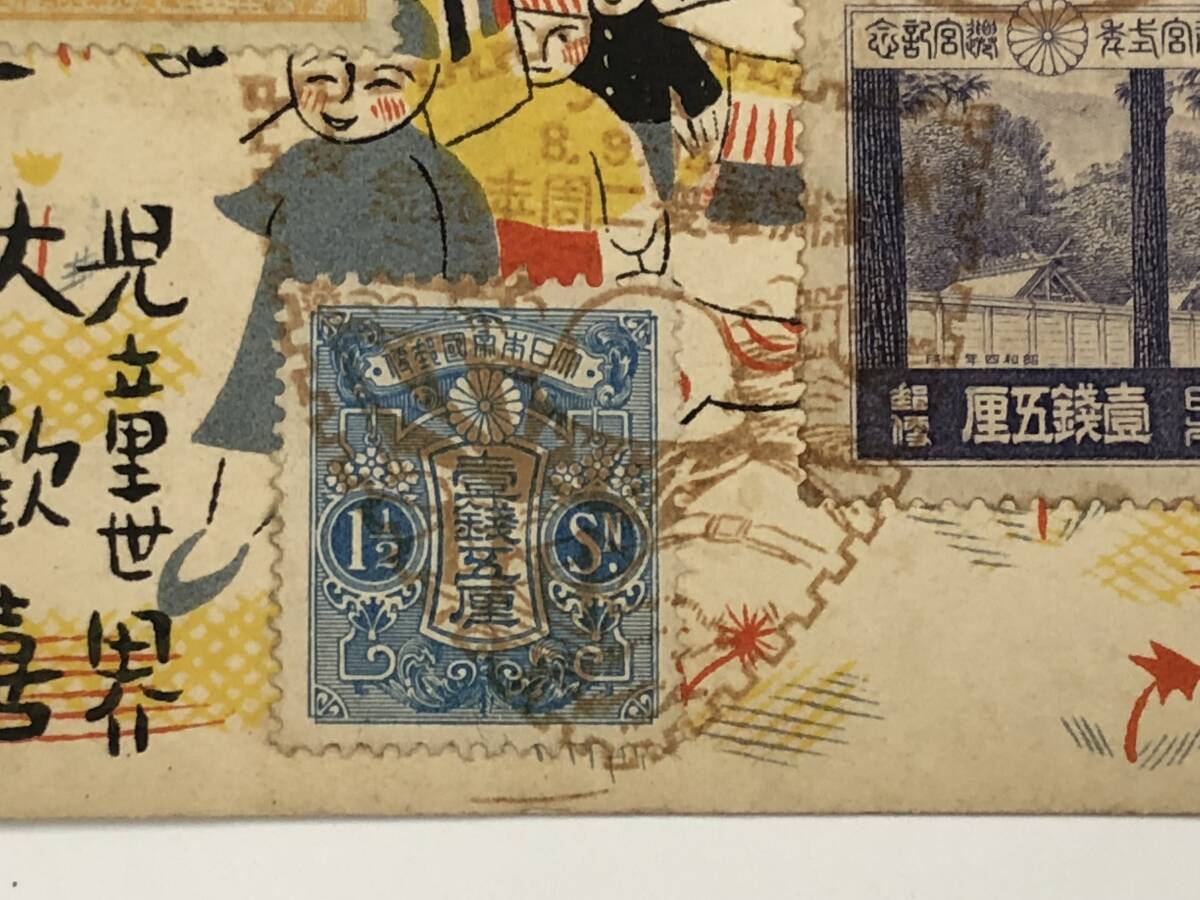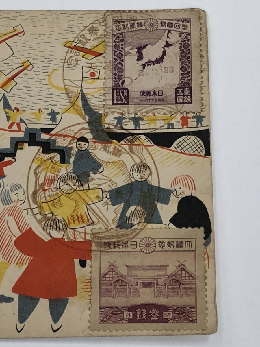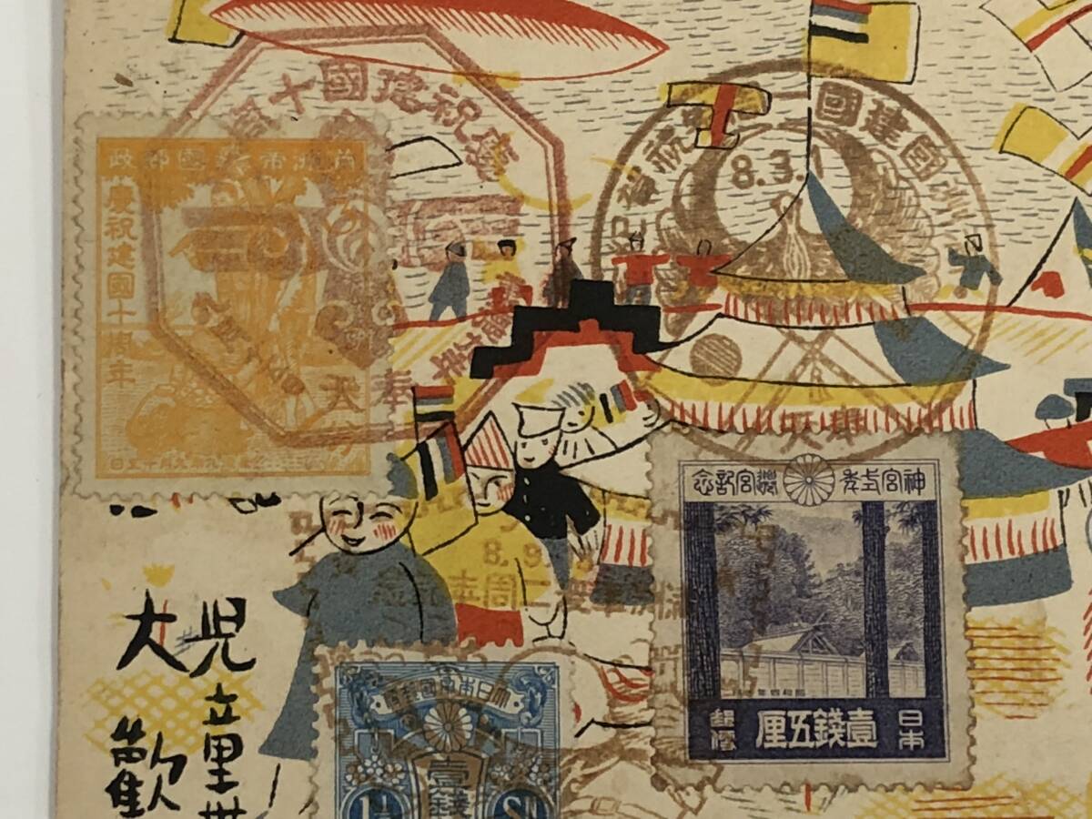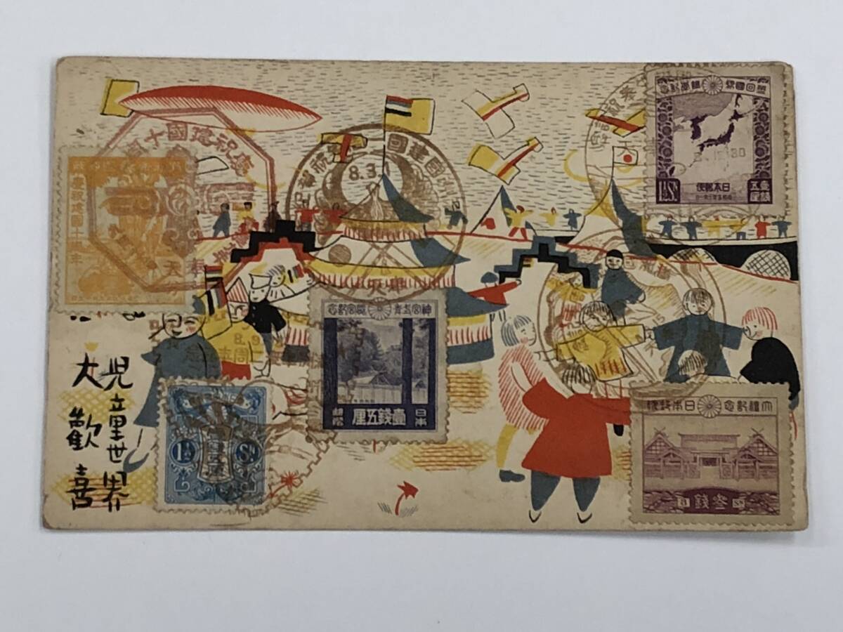 | 古絵葉書『児童世界大歓喜(B)』満洲国体育協会発行/切手5枚貼付/「奉天 満洲国建国一周年祝賀記念」など5か所押印/レトロ | ||