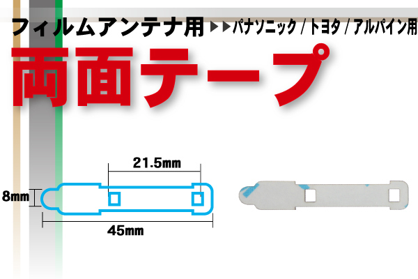 ~フィルムアンテナ用両面テープ1枚~ 超強力3M社製両面テープを基材としています。 接着後の使用温度範囲:-20度~150度 テープ色:グレー(純正と同様) JIS規格1種レベルに適合しています 取付形状をよくご確認の上、お買い求めください。 出品の商品は表題に記載された型式となります。 大量購入、追加購入をご希望の方は質問よりお問い合わせください。 ◆◆使用方法◆◆ 作業は下記の手順にて行ってください。 1、接着面の汚れや、水分、油分をふき取り、よく乾かします。 ※シリコンオフ等を使用してください。 2、片方の剥離しをはがし、アンテナ部に貼り付けます。 ※貼り直しをすると接着力が落ちますので、慎重に作業してください。 3、もう一方の剥離紙をはがしガラス面に貼り付けます。 4、親指で3秒ほど押し付けます 5、本来のテープの接着力がでるまで約1日かかります。 ※大きな力がかからないように注意してください。 | ||