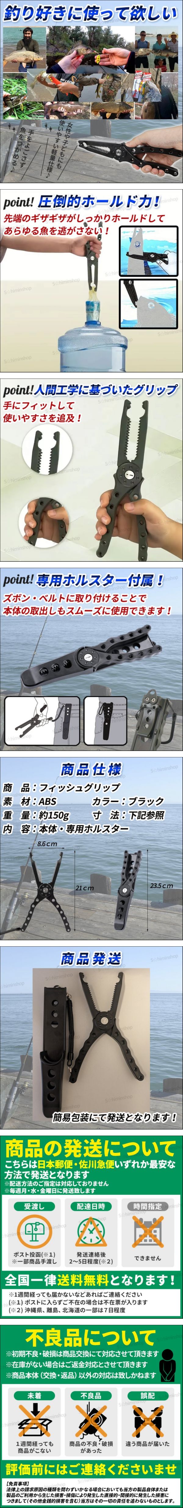 | 【商品】 ●フィッシュグリップ 【重量】 ●約150g 【カラー】 ●ブラック 【素材】 ●ABS 【内容】 ●本体・専用ホルスター | ||