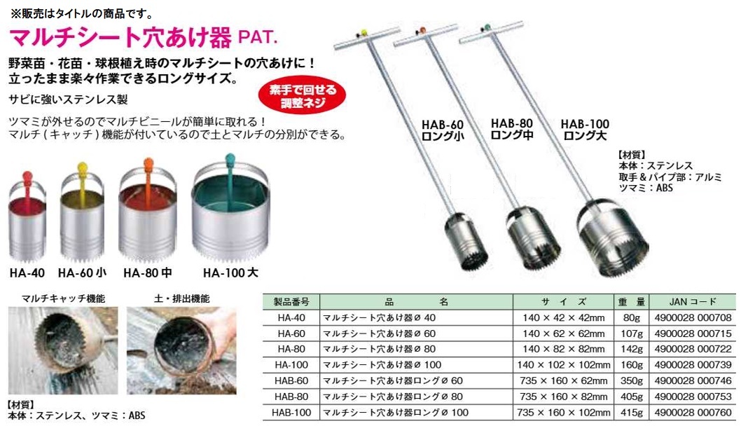 モトコマ MKKマルチ穴あけ器 φ40mm HA-40 ■用途野菜苗、花苗、球根植え時の穴掘り作業に!土とマルチビニールを一緒に掘り起こせ、ツマミが外せるので、マルチビニールと分別し取ることが可能。錆びに強いステンレス製。■材質・本体:ステンレス・取っ手&パイプ部:アルミ・ツマミ:ABS