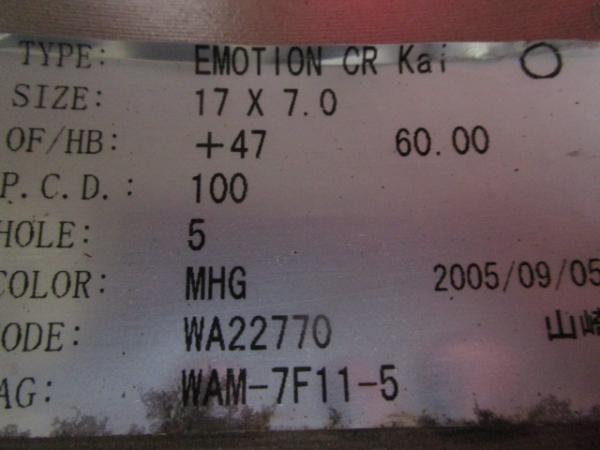 | ホイール詳細 | ホイール:WORK EMOTION CR Kai サイズ:7J×17 インチ +47 PCD:5H100 カラー:MHG CAP:無し 専用ナット:無し 状態 ガリ傷 :有り 腐食 :無し ディスク面傷 :有り 使用感 :有り コメント:写真のようなキズがあります。 4本リムにガリ傷があります。 2本リムに欠けがあります。 |