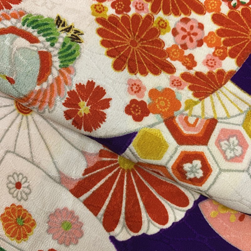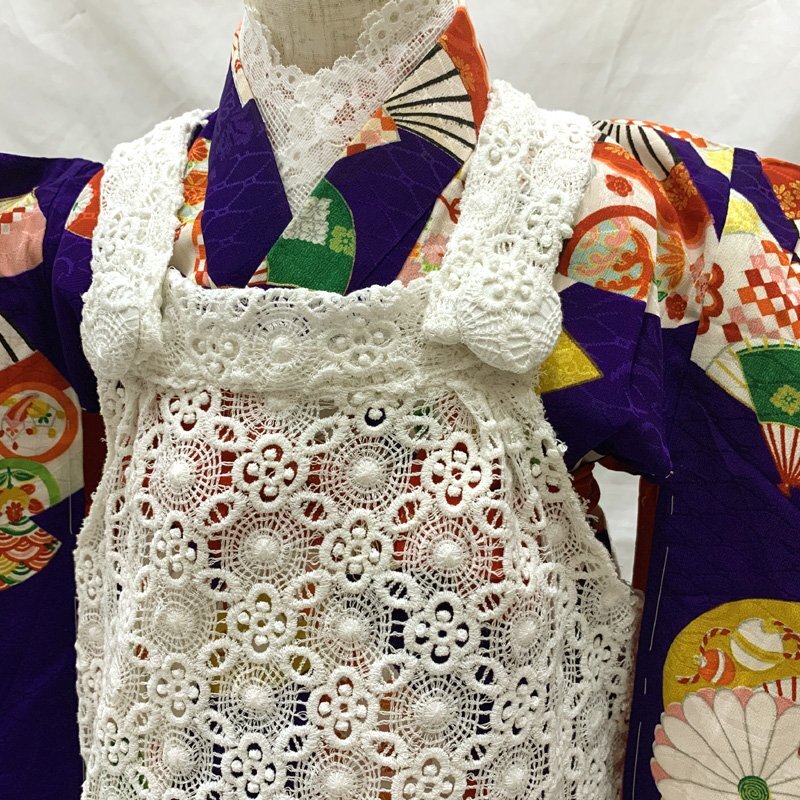 | □七五三 三歳 アンティーク 女児 着物&被布 扇 菊 青紫□美品 (No.fd) *こちらの商品は一つ身の着物&ハンドメイドの被布ワンピースのセットです。その他の小物はセットに含まれません。 人気のアンティーク着物に、ハンドメイドの被布ワンピースを合わせました。青紫系の地に、カラフルな扇や菊文様が可愛らしい七五三3歳のお着物セットです。 (着物)3歳のお着物として使用する際は、肩上げ、腰上げをしておりませんので、お子様の裄丈、背丈に合わせてお直しをお願いします。写真の様な糸のツレ?のような線跡がいくつかございますが遠目で見ると分かりません。 (長襦袢)こちらには長襦袢が付属いたしません。代わりにお子様の負担が少なく便利な「子ども用楽々衿」をお勧めします。#ag楽々衿 (被布)既製品の生地で作成したワンピース被布です。ハンドメイド品ですので、完璧を求める方はご遠慮ください。 【表地素材】(着物)正絹、(被布)綿 【色】青紫系 *モニターによって色味は実際と異なる場合がございます。 【サイズ】(着物) 裄:41cm、肩上げ幅:0cm、袖幅:24cm、袖丈:55.5cm、丈(肩から):93cm、腰上げ幅:0cm、前幅:15cm、後幅:16cm (被布) 幅:38cm、丈(肩から):57cm *素人採寸のため、多少の誤差はご容赦ください。 七五三後は、お正月やお節句などにもいいですよ。お求め安い価格での出品ですので、いかがでしょうか?アンティーク着物で古い物ですので、それなりのシミや汚れ、ほつれなどダメージ等あるかと思います。新品同様の綺麗さをご希望の方、少しのシミやアク、ほつれなどアンティークに御理解頂けない方のご購入はお控えいただきますよう、お願いします。 | |