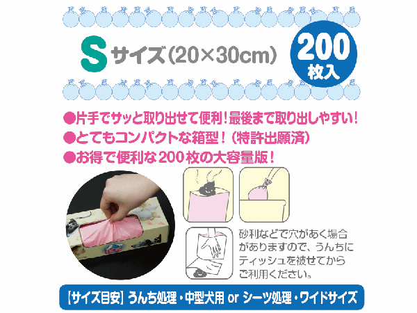もう水に流さない。うんち処理の新習慣!驚異的な防臭力を有する高機能素材「BOS」を使用した、ペット用のうんち袋です。悪臭をしっかりと遮断し、うんちの後もにおいを気にせずお散歩を続けることができます。袋に入れて、結んでゴミ箱に捨てるだけなので、後処理がとても簡単です。トイレに流さないので、一般家庭用トイレの場合、1回当たり約13L分の水を節約することができます。 対象:小型犬・猫などのペット 【特長】 ●驚異的な防臭力を有する高機能素材「BOS」を使用した、ペット用のうんち袋です。 ●うんち処理の後もにおいを気にせずお散歩することができます。車内でも快適! ●袋に入れて、結んでゴミ箱に捨てるだけなので後処理も簡単です。 ●袋を二重にしたり、トイレに流したりする必要もありません。 ●片手でサッと取り出せて、とてもコンパクトな箱型です。 ●安心の日本製品です。 内容量:200枚 サイズ(約):20×30cm 材質:ポリエチレン他 生産国:日本 【ご使用方法】 ●砂利などで穴があく場合がありますので、うんちにティッシュを被せてからご利用ください。 ●袋に手を入れ、うんちをつかみ、そのまま袋を裏返してください。 ●袋の口を数回ねじり、しっかり結んでください。 ●そのままゴミ箱に捨ててください。 【ご注意】 ※窒息などの危険がありますので、子供の手の届かないところに保管してください。 ※突起物などにひっかかりますと、材質上破れることがありますのでご注意ください。 ※火や高温になるもののそばに置かないでください。 ※本来の使い方以外には使用しないでください。 |