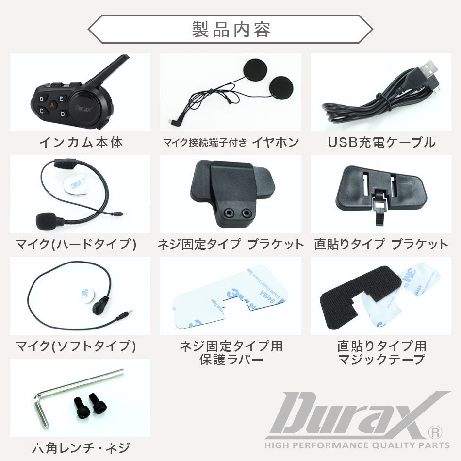 | 6台接続可能、2人の間で電話のようにハンズフリー通話ができます。 さらに、Bluetooth接続でスマートフォン、iPhone、iPod、ミュージックプレイヤーの音楽をステレオ高音質で聴けます!! 聞き取りにくい音もカットする、ノイズキャンセラー搭載! 防水機能で、にわか雨でも大丈夫! 【商品仕様】 本体サイズ(約):幅10cm、高さ7.5cm、厚み2.3cm ペアリング通話可能数:2台間無線通信可能 ペアリンググループ数:インカム5台と接続可能 最大通信距離(約):1200m(直線距離。環境により変動) 使用可能時間(約):(待機時)400時間 / (通信時)22時間 バッテリー容量:800mA 充電時間(約):2.5時間 防水:IP67 ノイズレス機能:CVC8.0 自動ノイズリダクション機能/DSP ノイズキャンセリング機能 Bluetoothバージョン:5.1 携帯電話からの着信可能 USB接続での充電 自動応答機能付き 選べる2種類のマイク 【商品内容】 本体 ×2 マイク接続端子付きイヤホン ×2 USB充電ケーブル ×2 ネジ固定用ブラケット ×2 直貼り用ブラケット ×2 マイク(ハードタイプ) ×2 マイク(ソフトタイプ) ×2 ネジ固定タイプ用保護ラバー ×2 直貼りタイプ用マジックテープ ×2 レンチ・ネジ |