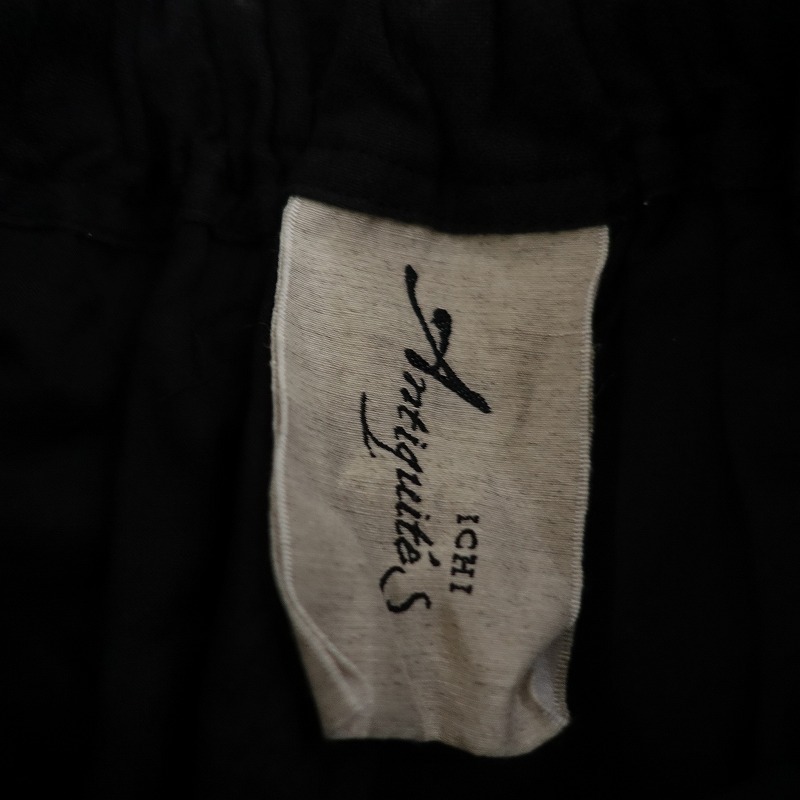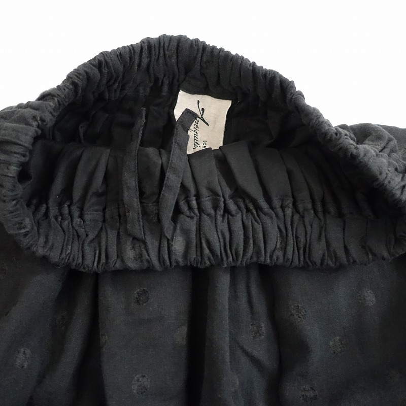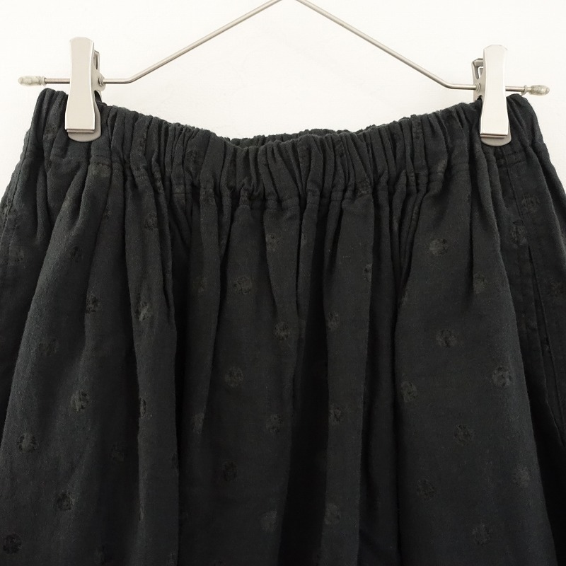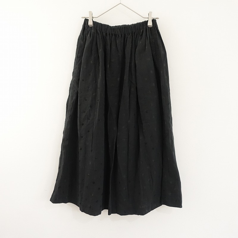 | ICHI Antiquite’sのリネンドットギャザースカートです。カラーはブラックで、ドット柄の施されたリネン地で仕立てられています。ウエストはゴム仕様に、ひもが通っており調整可能です。両サイドにシームポケット付き、定価(メーカー希望小売価格) 20,900円の商品です。 |