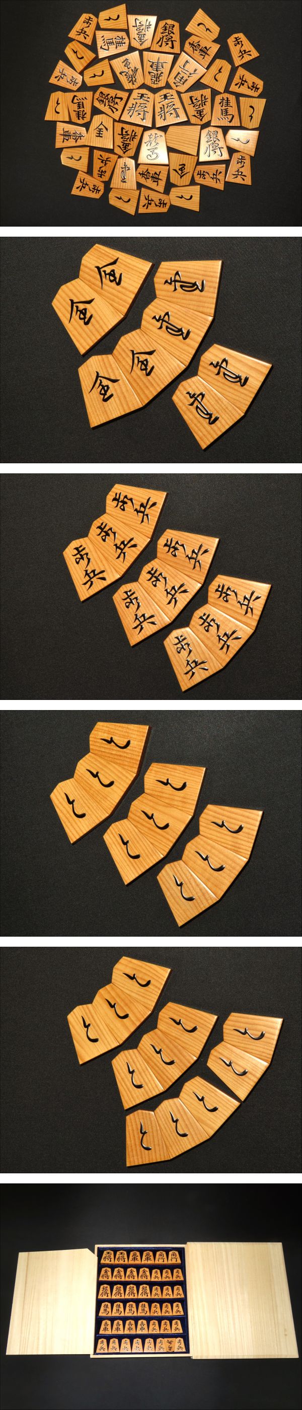 書体は人気の「宗歩好(そうほこのみ)」、棋聖天野宗歩が好んだと伝えられる書体です。毎年名人戦第一局に限り使用される名駒、名人駒(将棋連盟所蔵、奥野一香作)がこの「宗歩好」です。本作は名人駒に倣って双玉仕立て。