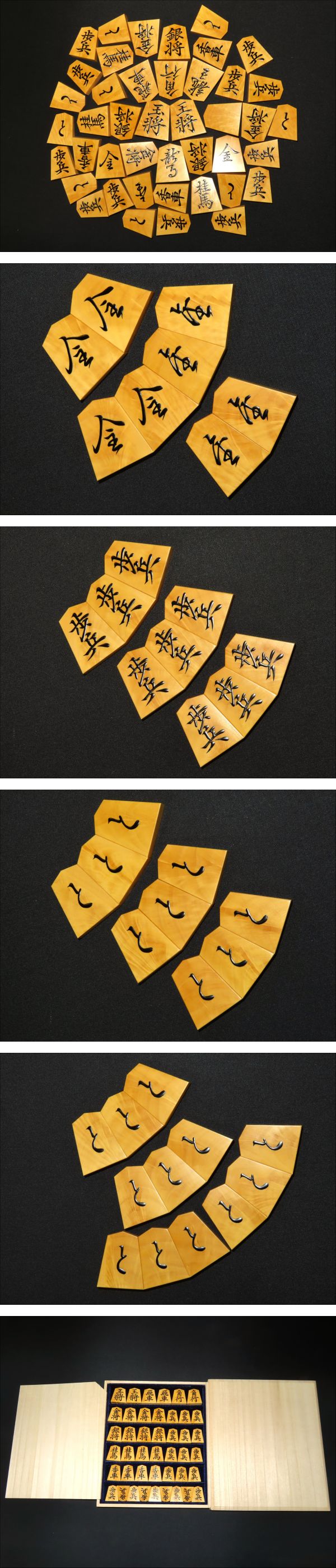木地は薩摩黄楊孔雀杢。ご覧の通り非常に味の良い木地です。全ての駒の表裏をUPいたしましたので是非ご覧ください。
