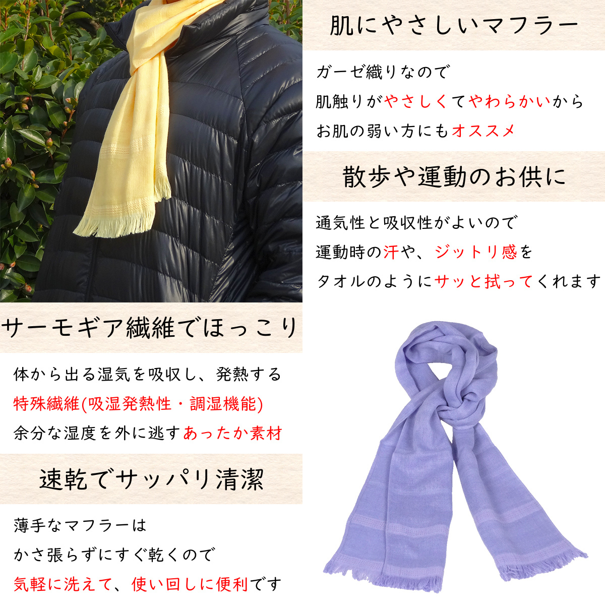 | サーモギア繊維の特徴 サーモギアは、ベンベルグとマイクロ抗ピルアクリルを組み合わせた素材 吸湿発熱性と調湿機能に優れ、ソフトな触感が暖かさをもたらします 発色性や吸放湿性に優れ、シルクのようななめらかさと光沢性を持ちます 旭化成せんいのサーモギア®を使用した、あったか発熱繊維です。 軽くてやわらかい お肌に優しく、チクチクしないストール 水分もしっかり吸収し、速乾性も抜群 洗濯も気軽に丸洗いできます コンパクトに持ち運び 軽くてコンパクト いつでも持ち歩ける便利さ、いざという時の備えに マフラーの上にジャケットを着ければ、襟元の汚れ防止 国産ならではの安心感 このマフラーは、国内で製造されています。 信頼性のある地域の技術と品質管理によって作られており、品質に対する安心感があります。 ウォームマフラーの特徴 サーモギアと綿を組み合わせたマフラー 繊維の中に閉じ込められた暖められた空気が、軽やかに体を包み込み、暖かさをキープします 軽やかな肌触りで、どんなスタイルにも調和するアイテムです 体から出る湿気を吸湿し、発熱する特殊な繊維を使用 同時に、調湿機能で快適な着心地を保ちます |