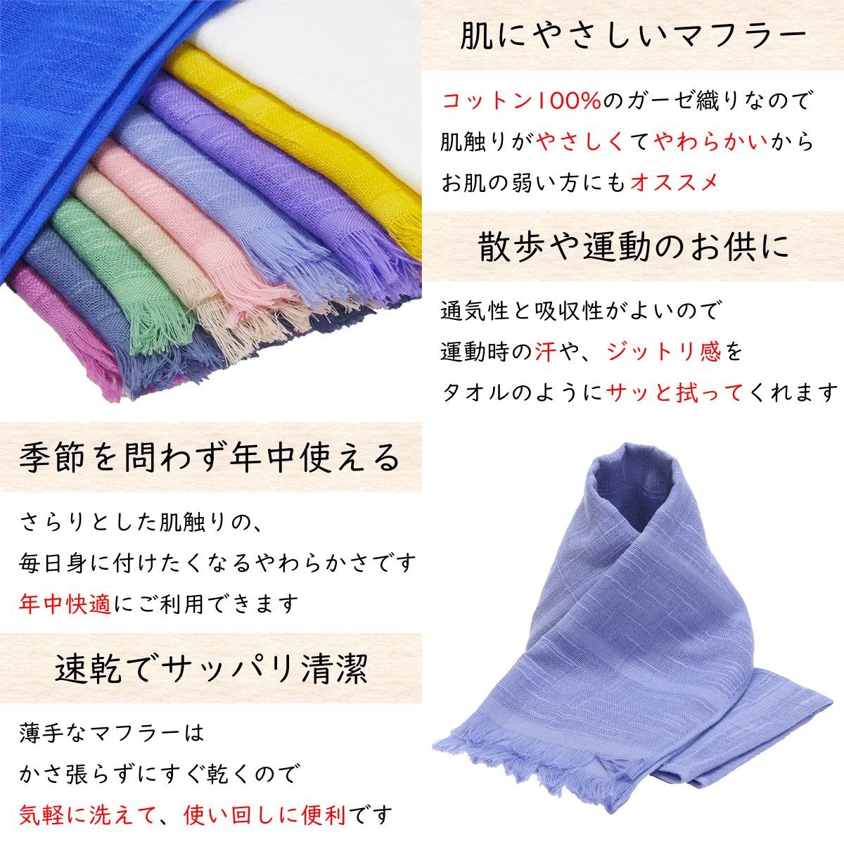 | 速乾でスッキリ清潔 コットンマフラーは、洗濯後に素早く乾くので、日々のお手入れが簡単です。 いつでも気軽に洗濯して清潔さを保つことができます。 快適な清潔感を保つための便利な特性を持っています。 コットンは肌触りバツグン% コットン100%の素材は、心地よい肌触りを提供します。 湿気を逃がす性能により、肌が爽やかな状態を保ちます。 国産ならではの安心感 このマフラーは、国内で製造されています。 信頼性のある地域の技術と品質管理によって作られており、品質に対する安心感があります。 コットンマフラーの特徴 コットン100%の素材は、通常の使用でも優れた性能を発揮します。 軽量で薄く、やわらかな感触を提供するのが特長です。 また、折りたたんでも場所を取らないため、持ち運びにも便利です。 紫外線対策としても活用でき、日焼け止めと併用することで効果が高まります。 |
