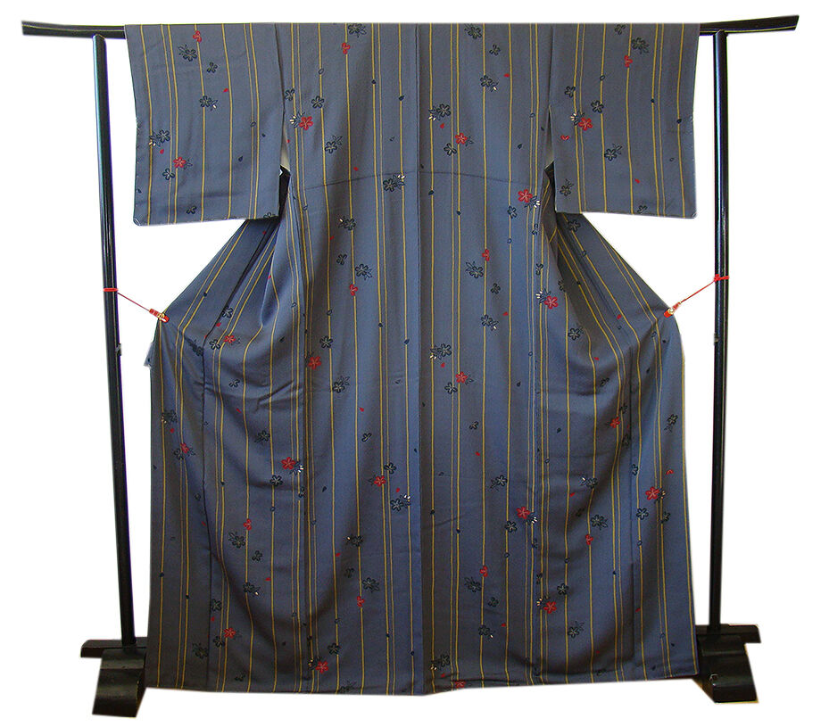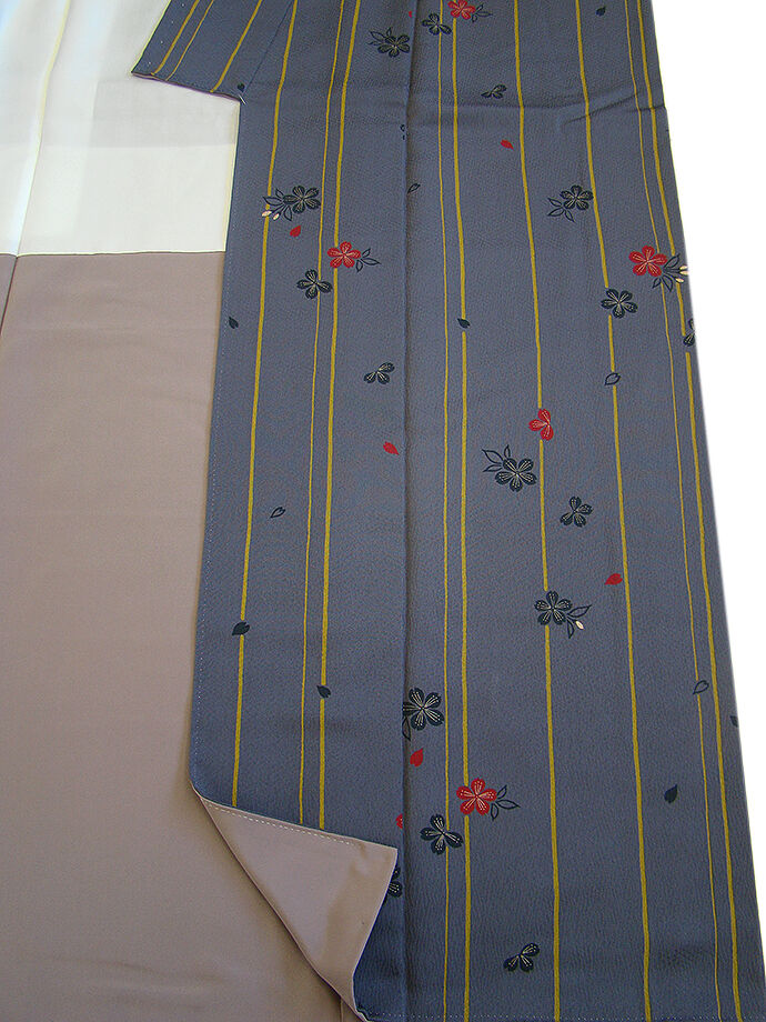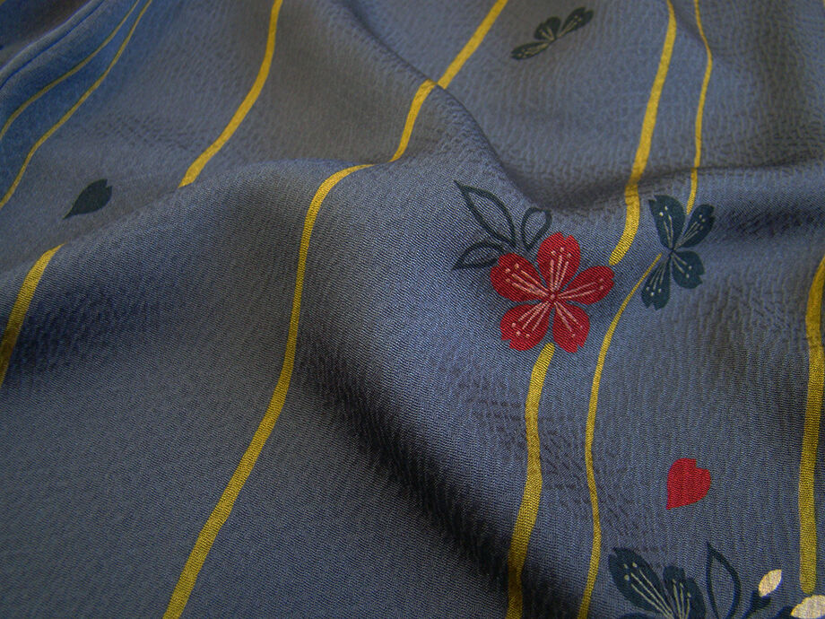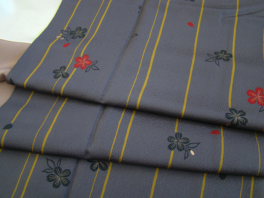 | 商品説明 | こちらのお品は「袷」ですので10月から5月までお召頂ければと思います。 とてもしなやかな手触りの着心地良い重めの滑らかな極上ちりめん地の変り織の生地、 渋い藍鼠色地に地模様入りにからし色の変り縞に花草柄の染柄、 八掛は霞色(正絹)、幅広い年代の方にお召頂けます。 |