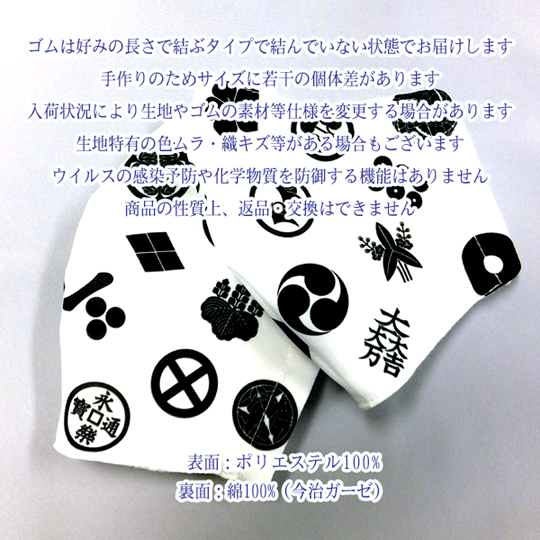 | 注意 | ゴムは好みの長さで結ぶタイプです。 結んでいない状態でお届けします。 手作りのためサイズに若干の個体差があります。 入荷状況により生地やゴムの素材等、仕様を変更する場合があります。 生地特有の色ムラ・織キズ等がある場合もございます。 ウイルス感染の予防や化学物質を防御する機能はありません。 商品の性質上、返品・交換はできません。 |