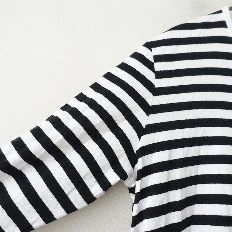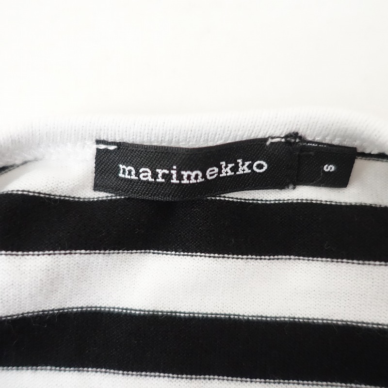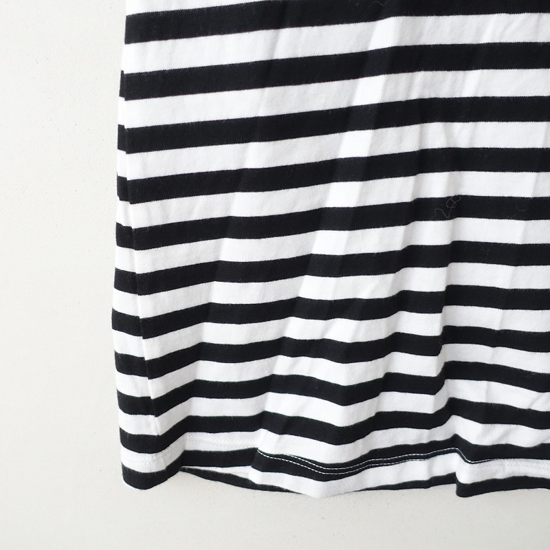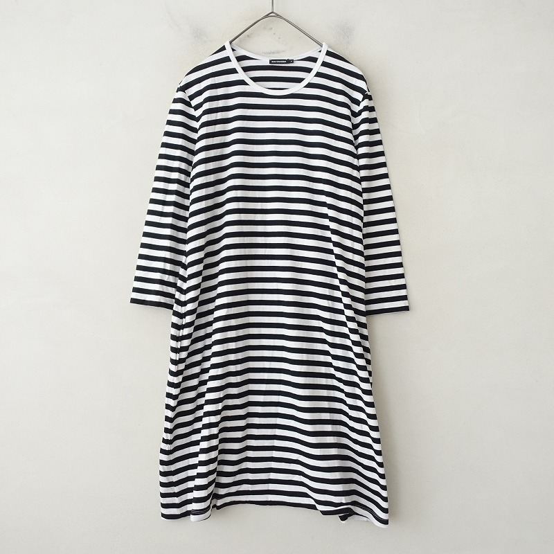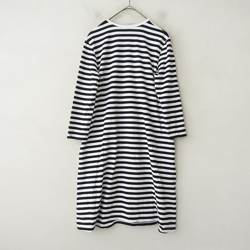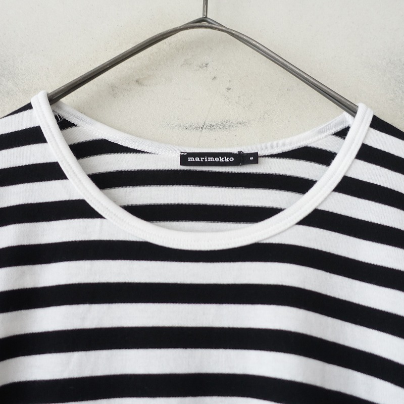 | marimekkoのコットンボーダー柄カットソーワンピースです。カラーはブラック×ホワイトのボーダー柄で、薄手のカットソー素材です。プルオーバータイプで、ネックラインはパイピングが施されており、左右ウエストにシームポケットがございます。 |