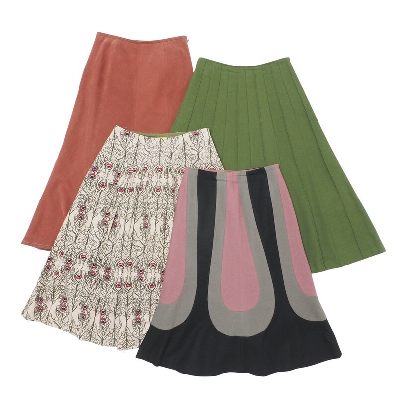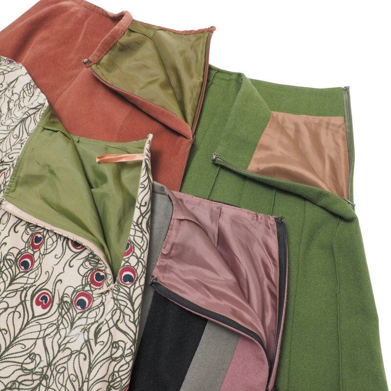 | サイズ | 【表記サイズ】 (1)(3):40 (2)(4):38 (※念の為、商品実寸をご参考下さい。) 代表して(1)(2)のお品を測定 (1) 【表記サイズ】 40 【商品実寸】 ウエスト:約64cm ヒップ幅:約46cm(ファスナー終わりの位置で計測) 総丈:約78cm (2) 【表記サイズ】 38 【商品実寸】 ウエスト:約64cm ヒップ幅:約45cm(ファスナー終わりの位置で計測) 総丈:約72cm | ||