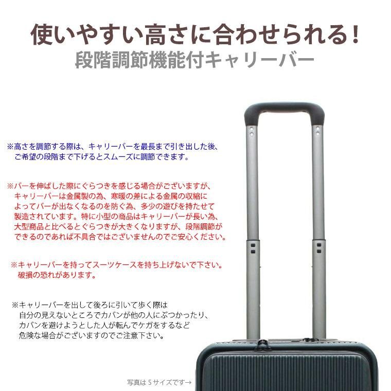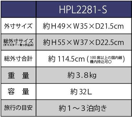 商品の製造過程や保管時にできた細かな傷や目立たない汚れがある可能性があります。 ご使用に際しては問題ございません。気になる方は入札をお控えください。 アウトレット品にご理解を頂ける方の入札をお待ちしております。 便利なフロントオープンポケットを搭載したジッパースーツケース≪エイチプラス/HPL2281≫ 『サスペンション&ストッパー付き双輪キャスター』や2Wayで使える『TSAロック付シフレロック』など、充実の機能で快適な旅をサポートします。 49cmは100席以上の国内線機内持ち込みOKなので、出張や研修など幅広いシーンで活躍します。