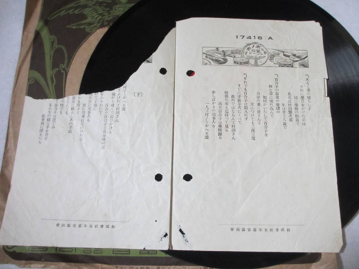 中古SP盤(上・下)です。歌詞付ですが裏面に破れがあり補修出来ません。5枚目の写真(下)の赤丸の部分に薄いスジ線のようなヒビ線跡があります。完全に割れてませんので試聴出来ると思いますが裏にも跡が残ってます。他は薄い擦り傷汚れがあり美品ではありません。(試聴してませんので見た目でしか判断出来ませんので状態は擦り傷と傷に分けてあります)状態等は写真にてご覧下さい。送料は定形外郵便(規格外)で1枚660円・2~3枚920円・4枚以上は950円(東北・関東は750円で中国・四国1100円・九州地域の方は1500円でお願い致します)でクロネコヤマト宅急便にて発送致します。ゆうパックの場合は着払いでお願い致します。大変申し訳ないのですが連絡等は次の日にさせて頂きます。他にも出品してますので是非ご覧下さい。