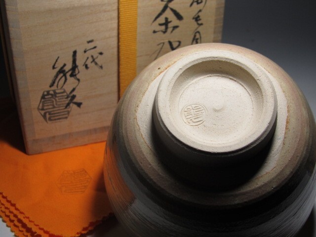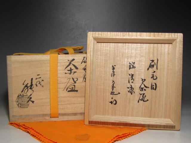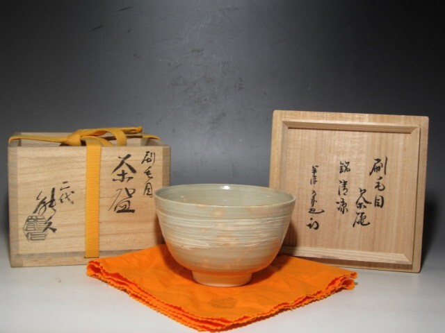 中村能久作の刷毛目茶碗「清涼」です。 箱蓋裏に久田流十二代尋牛斎花押のある大変趣のある素晴らしい作品です。 サイズ 直径12㎝×高さ7.5㎝(多少の誤差はお許しください) 状態 一見して疵やヒビ・直しは見られません。 骨董品という事をご勘案頂き、時代経過のスレや、小さな傷がある場合があるかもしれませんのでご承知置きください。 | |||