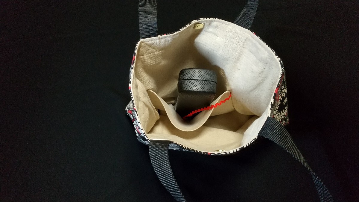 綿麻のキャンバス生地を使って手作りしました。大きさは、縦35、橫32、マチ約15cm、バッグの口から持ち手までの長さ17cm、外ポケット幅17、深さ15cm、内ポケット幅20、深さ15cmです。内ポケットには18cmの長さでカラビナを付けており、キーホルダー等を付けられます。口の真ん中はマグネットで閉じられます。初心者の作品です。