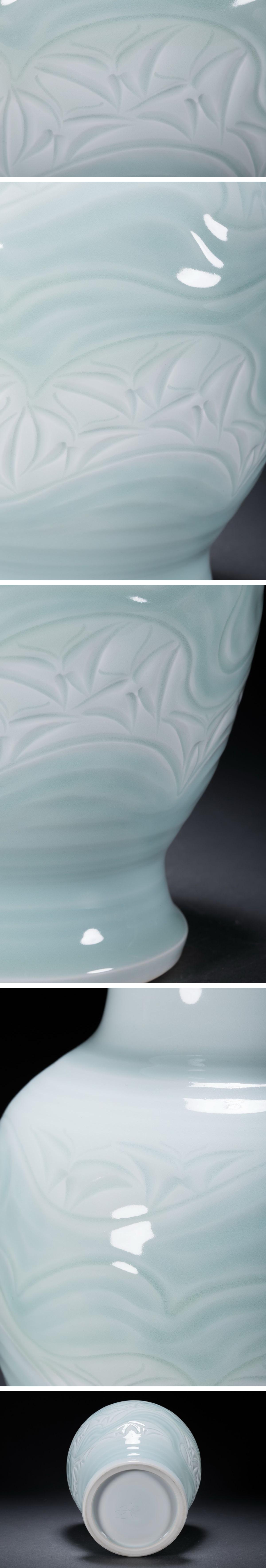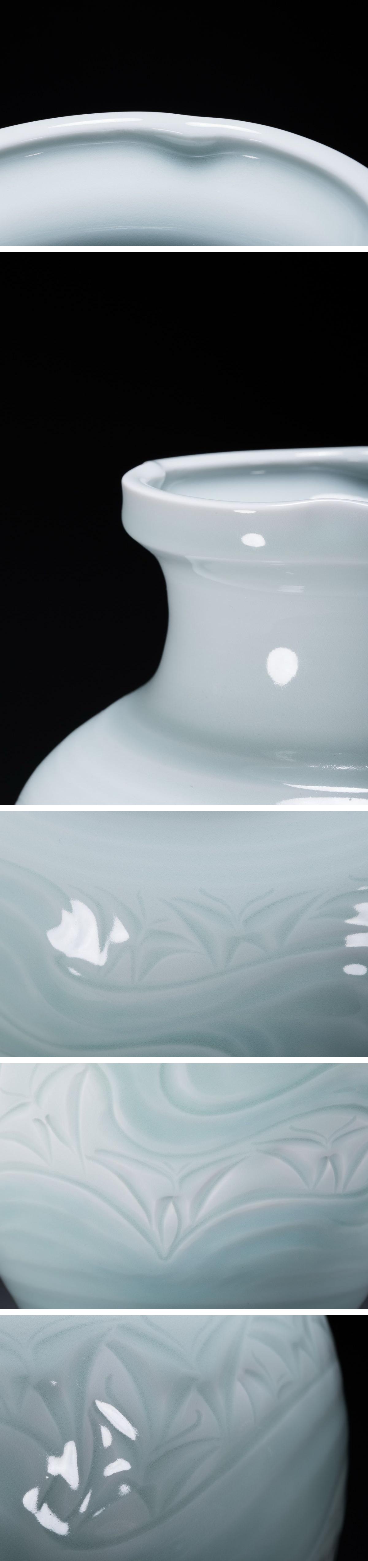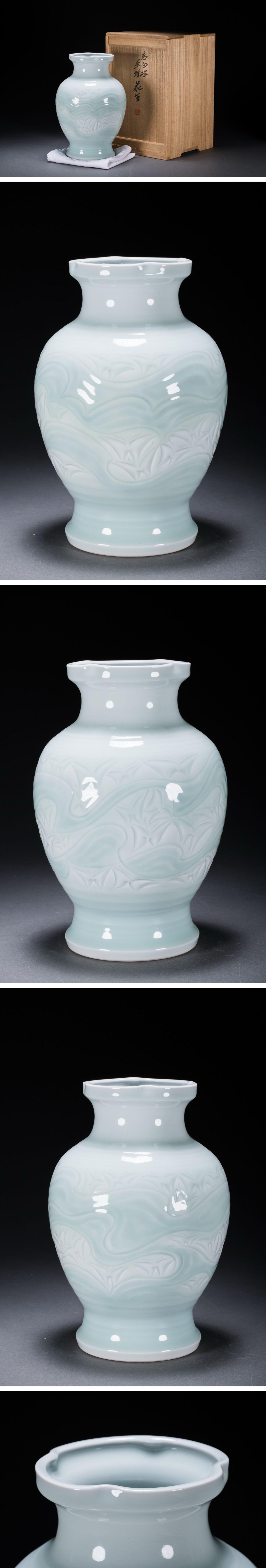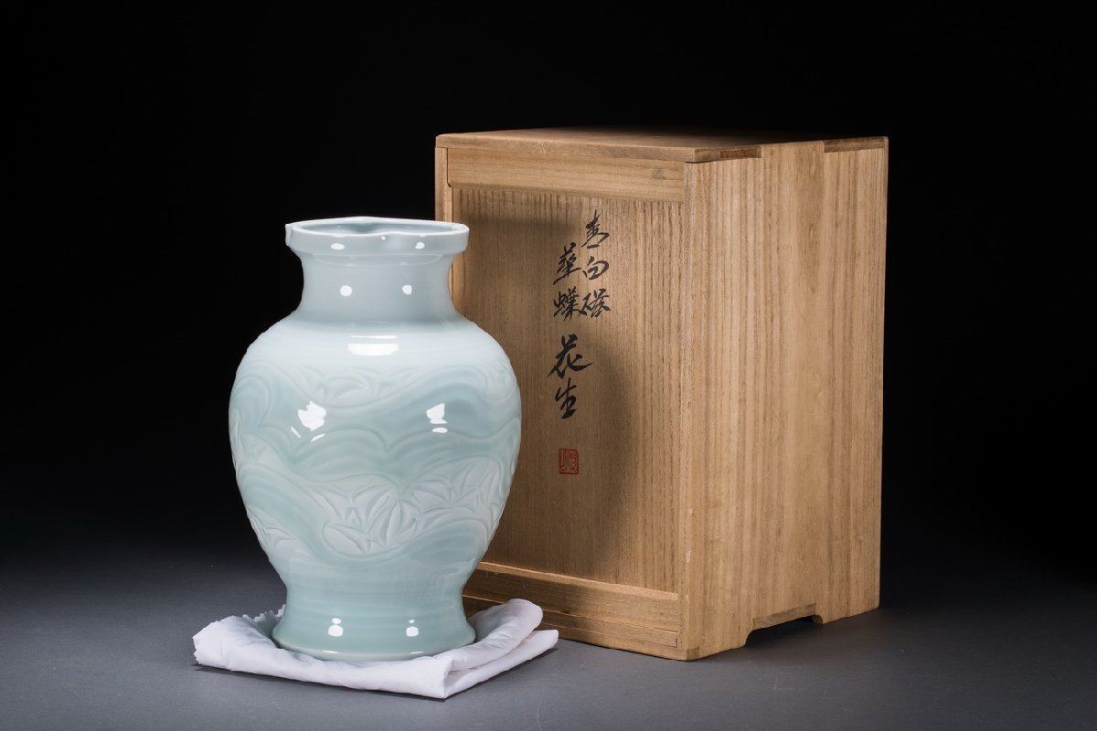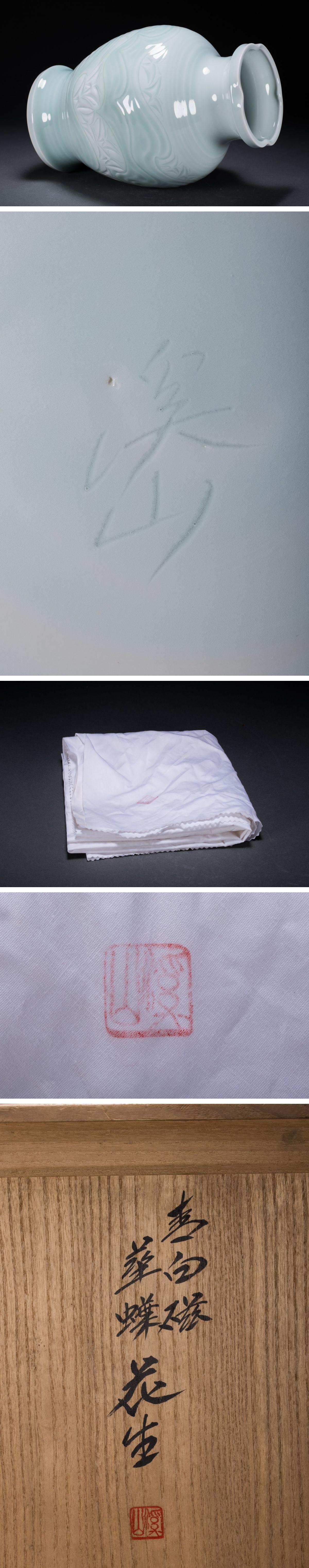【雲錦】某有名オークション購入 時代物 青白磁 華蝶花生 渓山造 共箱 古置物 古美術 時代コレクション7L10-196S04