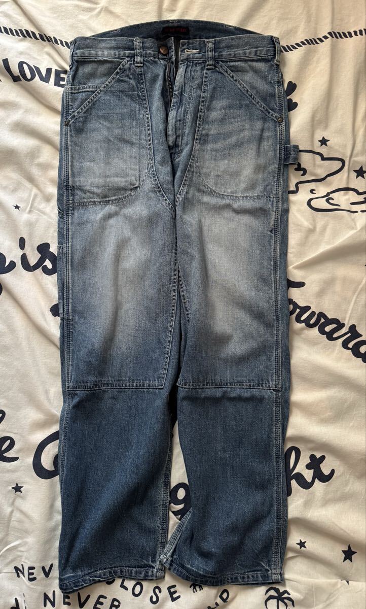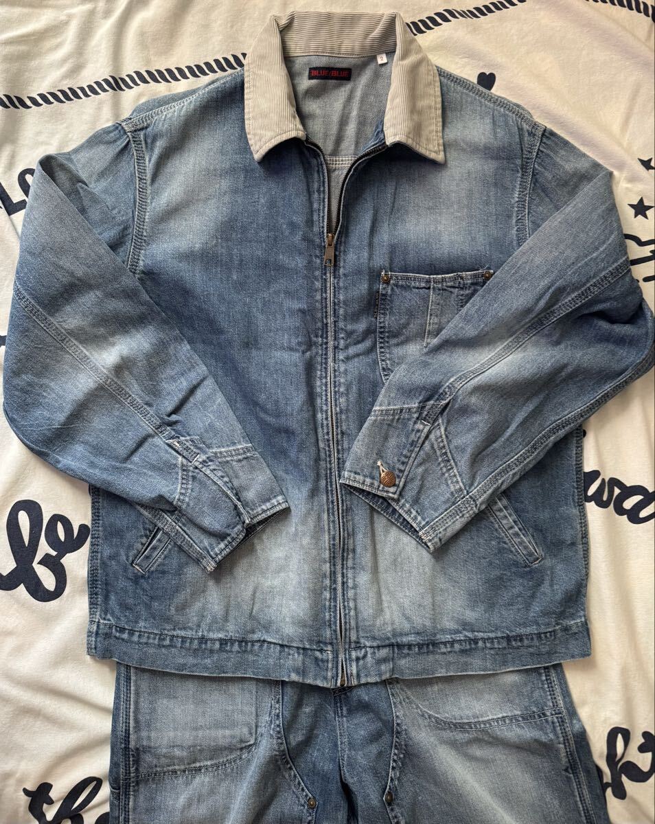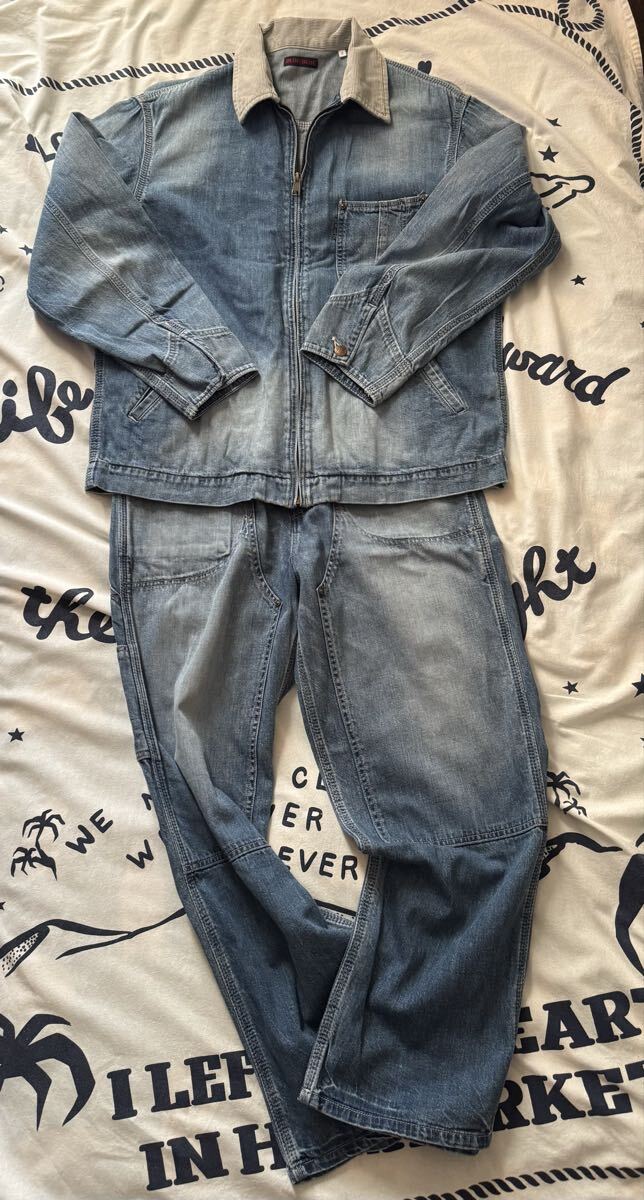 デニムジャケットとペインターパンツのセットアップです。2年前のモデルだったと思います。購入して2度着用した程度なので状態は良好です。上下ともにMサイズです。実寸サイズデニムジャケット肩幅49cm 身幅61cm 着丈68.5cm 袖59cm ペインターパンツ 平置きウエスト40cm 股上35cm 股下72cm