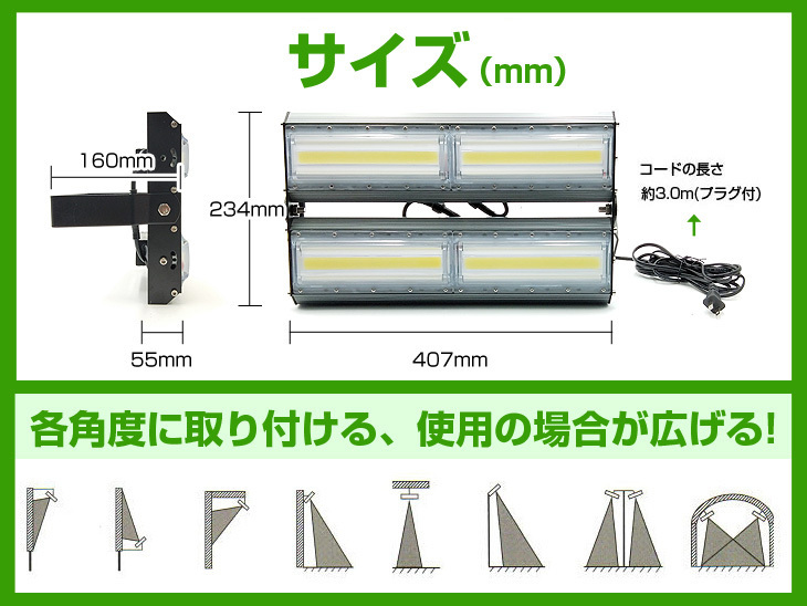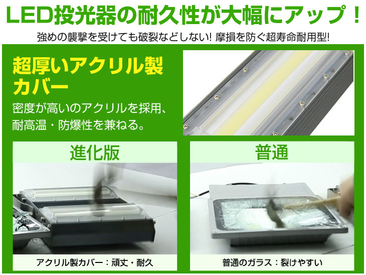 進化版 200W LED投光器 漸く登場! 200Wと省電力で、従来の2700W相当の明るさです! IP67規格の防水仕様!照射角度は240度に達します!公園、運動、屋外や現場作業にも便利です!特に、夕暮れ時夜間作業にとても役立ちます! 虫が集まりにくいの も魅力です。 ◆高品質のCOBチップ採用: 照射角度は240度に達します。高輝度寿命が50000時間に達します。省エネな製品だ! ◆優れた放熱性: 優れた6063型アルミ材質を採用、熱伝道スピードは伝統投光器の2倍以上!ヒートシンクには溝があり、空気とタッチする面積が増大します。 ◆防爆耐震ガラス: 耐圧強度が高いの防爆ガラスを採用。安定丈夫な材質で、長時間に使えます。 ◆IP67ラベルの防水性能: 密封性に優れ、IP67相当の防塵防水性能を実現!場所を選ばず様々な用途の照明に使えます。 ◆照射角度調整可能: 回転支えを使えて、お好みに照射角度を調整できます。 ◆広い使用範囲: トンネル、掲示板、ガソリンスタンド、夜間作業、現場工事、駐車場、公園、運動場にも様々な場所で活躍します!公園、運動、屋外や現場作業にも便利です!特に、夕暮れ時夜間作業にとても役立ちます! 虫が集まりにくいの も魅力です。 【保証】 ◆当商品は12っヶ月保証となります。 ◆お届けから1週間以内にご連絡のあった不良品の保証対応の送料は当方が負担いたします。 ◆保証期間内の不良品ですが、交換のみ対応しております。往復送料はお客様負担となります。在庫がない時だけ返金しますので、ご了承ください。 |