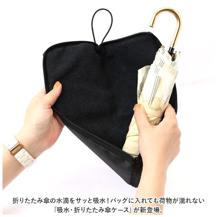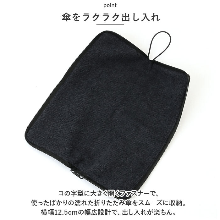 | 商品説明 | ・・折りたたみ傘の水滴をサッと吸水!バッグに入れても荷物が濡れない「吸水・折りたたみ傘ケース」が新登場。 ・【傘をラクラク出し入れ】 ・コの字型に大きく開くファスナーで、使ったばかりの濡れた折りたたみ傘をスムーズに収納。横幅12.5cmの幅広設計で、出し入れが楽ちん。 ・【雨の滴をしっかり吸水】 ・ポーチ内側全面は、吸水性のマイクロファイバー素材。折りたたみ傘をすっぽりと包み込んで、マイクロファイバー繊維の隙間に水滴をグングン吸水。 ・【吸水タオルにしてもOK!】 ・ファスナーを全開にすることで四角いタオル状に変身!雨の日、外出から帰った後のカバンの水滴をサッと拭き取れる。 ・【折りたたんでコンパクト】 ・小さく折りたためば、カバンの隅にちょこんと収納できるコンパクトサイズに。傘をしまう時にパッと取り出せるから便利♪ ・【収納用ループ付き】 ・玄関のフックなどに引っ掛けて収納できるゴムループ付き。お洗濯後に乾かすときにもとっても便利。 ・【ペットボトルカバーにも】 ・折りたたみ傘だけでなく、500mlペットボトル用のポーチとしても大活躍。冷えたボトル表面の水滴をすぐに吸収し、サラッと快適に持ち運び。 ・【大きめ折りたたみ傘もすっぽり】 ・お手持ちの折りたたみ傘の大きさに合わせて、ぴったりサイズが選べる「28cm×12.5cmタイプ」・「34cm×12.5cmタイプ」・「38cm×12.5cmタイプ」の3サイズ展開。 ・【選べるカラーバリエーション】 ・ベーシックカラーからネオンカラーまで、ファスナーテープ生地の色で自分のケースが見分けられるから、ご家族とお揃いでも大丈夫! |
