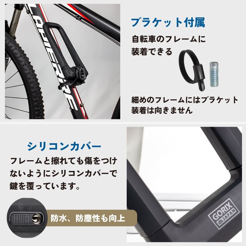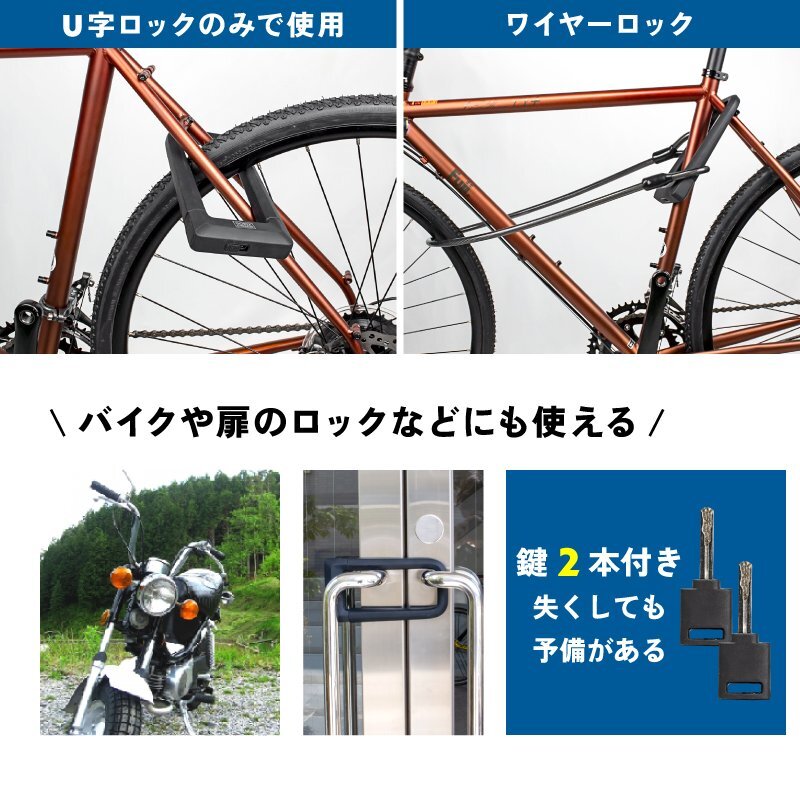 盗難防止レベルが高いとても頑丈なサイクルロックです。 U字ロック単体でも使えるしワイヤーロックを組み合わせても使える。 U字ロックは頑丈で高強度な合金鋼と亜鉛合金シリンダーを採用。 12トン油圧カッターでも切れないしハンマーで叩いても破損しにくい。 ワイヤーは長く1.2mmでポールや木などにくぐらせる事ができる。 地球ロックして抜群のセキュリティーに。素材は強いスチールコードを編み込んだダブルケーブルで切断しにくい。 U字ロック本体はシリコンでカバーされているため自転車のフレームと擦れてもフレームを傷つけない。 またシリコンカバーを利用する事で防水、防塵性が向上。 鍵穴には埃や水の侵入を防ぎ錆びないようにスライド式のカバーを施してあります。 鍵2本付属で1本失くしてもスペアキーがあり安心。 また付属のブラケットを使用する事でフレームなどに装着する事が可能に。 (細いフレームは固定力が不安定になるためおすすめできません。) ロードバイクやクロスバイク、mtb、電動自転車などの自転車全般の盗難防止に。 また原付やオートバイなどのバイクや扉のロックなど様々な場面でお使いいただけます。 商品内容U字ロック本体、ワイヤー、鍵2本、ブラケット、日本語説明書 素材高強度な合金鋼、亜鉛合金シリンダー、シリコンカバー サイズロック本体:長さ21、外幅10-11mm、内幅約6.5cm、断面直径22mm、スチール芯直径約14mm ワイヤー:総長1.2m 重量約850g 適用自転車だけでなく、オートバイ、電動自動車、原付、スクーター、ドアなどに適用するU字ロックです。 | |