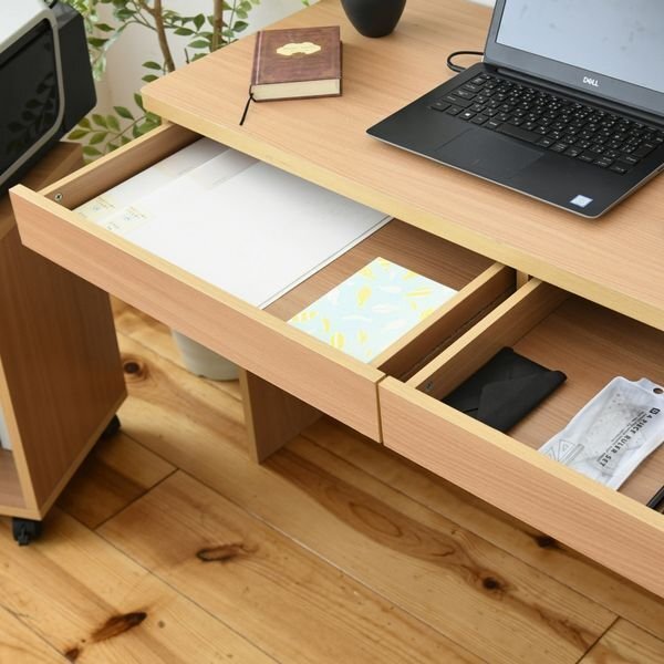 | シンプルなデスクにチェストとラックが付いた3点セットアイテム。 デスクの足元には配線が収納できるスペースがあり、パソコンなどの充電コードが邪魔になりません。 幅100cm、奥行45cmのコンパクトなデザインは、 書斎でもリビングでも置き場所に困らずご使用いただけます。 |