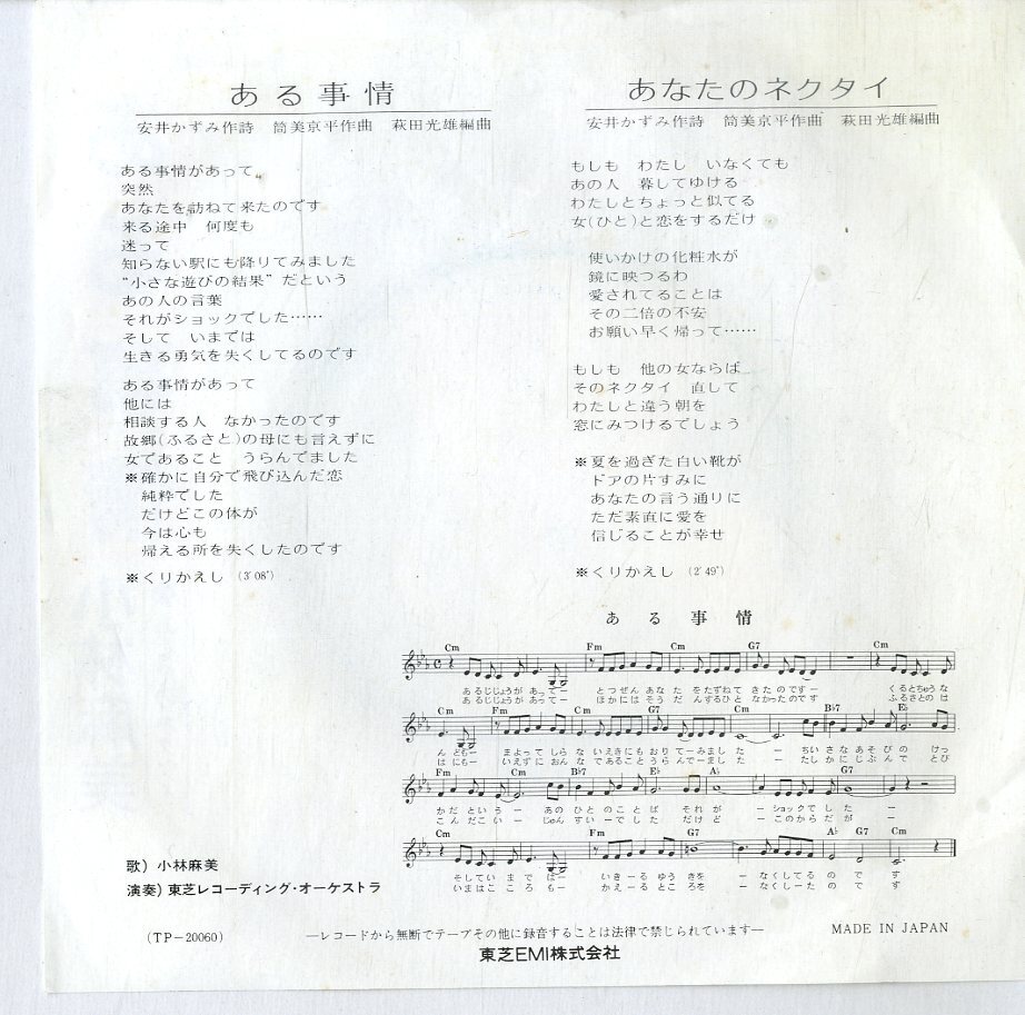 C00184054/EP/小林麻美「ある事情 / あなたのネクタイ (1974年・TP-20060・筒美京平作曲)」 [浏览原始页面]