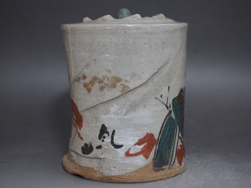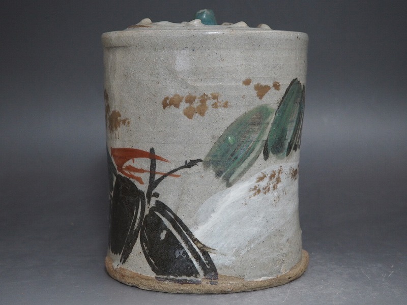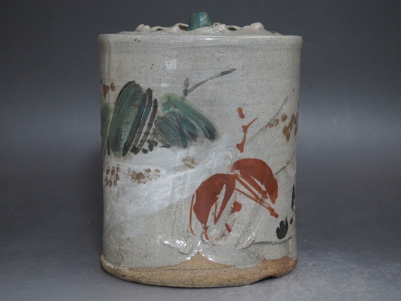 | B2004 乾山 色絵笹文水指 時代物 ☆ 旧家蔵出 骨董 古い 古美術 茶道具 茶器 抹茶道具 茶の湯 水指 共蓋 陶器 乾山写 尾形乾山 在銘 作家物 | ||