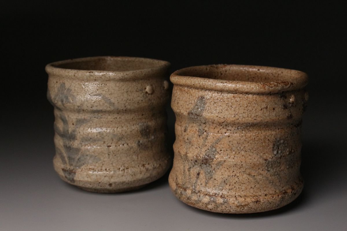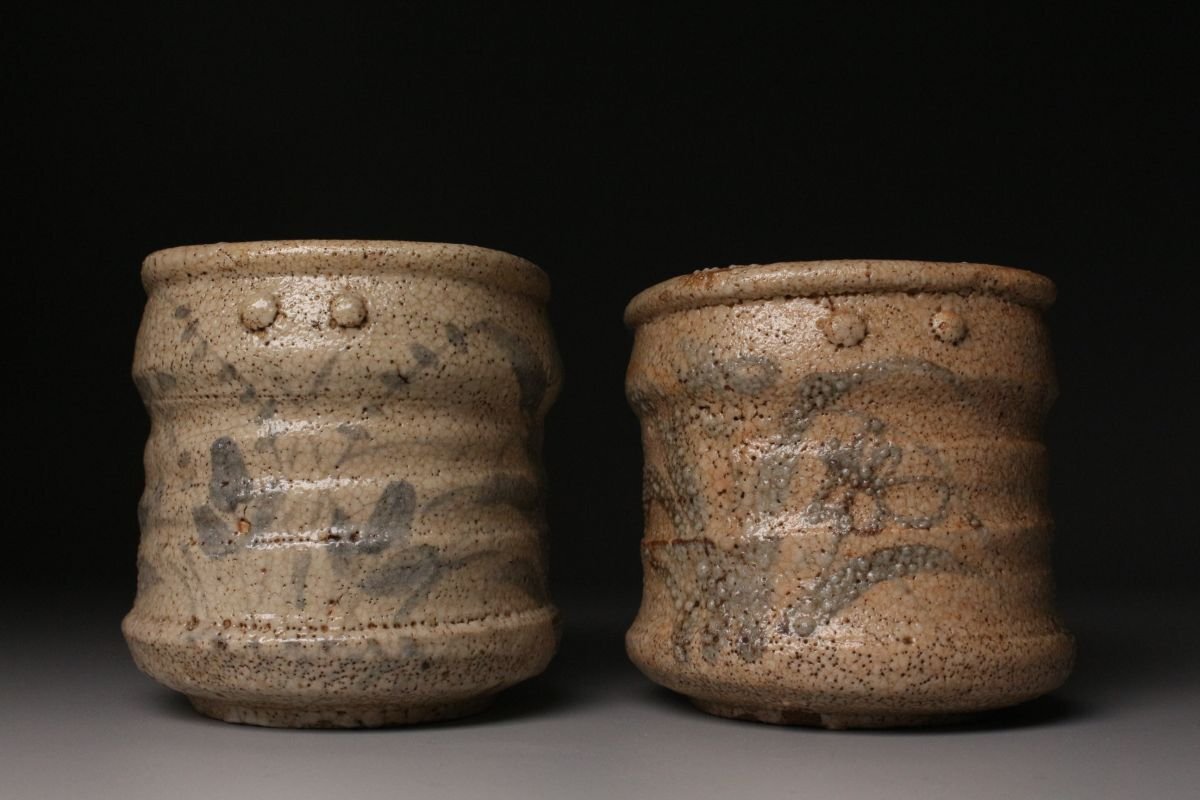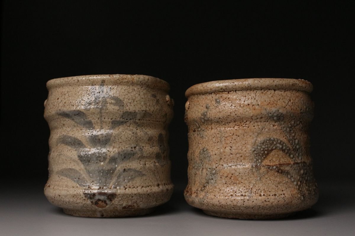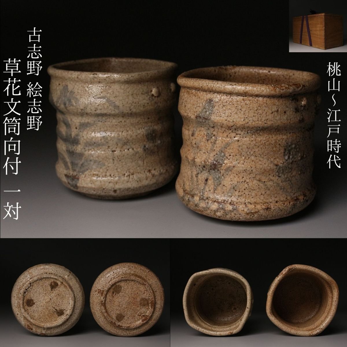 [.WW]25.11 25110907A* * * 商品詳細 * * * ここでしか出逢うことのできない唯一の美をご紹介させて頂きます。 古志野の息遣いを映す、一対の筒向付。 柔らかな土味に鉄絵で描かれた草花文がそっと寄り添い、 志野特有の景色と相まって、静かな詩情を漂わせます。 一方は赤みを帯びた温かな古志野、 もう一方は白乳色にやわらかく霞む志野。 対を成すことで、それぞれの色合いが際立ち、 古志野が持つ多彩な表情を素直に味わうことができます。 鉄絵の草花文は素朴でありながら生命力に満ち、 焼成によって生まれた景色が土の息吹を感じさせ、 古陶の自由な精神をそのまま伝えるかのようです。 二つの器が響き合う静かな品格―― 古志野ならではの奥ゆかしさと温もりを、 どうぞお手元でじっくりとご堪能ください。 ■商品内容/ 火入2点、箱 ■サイズ/横9.5㎝×高10㎝ 箱:横23.5㎝×高13.5㎝×奥行12㎝ ■状態/経年による スレ、小傷、汚れ 箱にスレ、傷、汚れ、蓋の桟の直しがございます。 ※写真にてご確認、ご了承の上ご入札下さい。