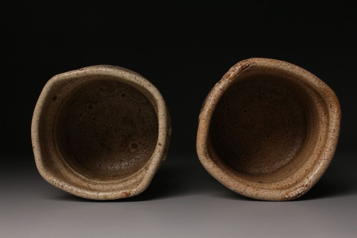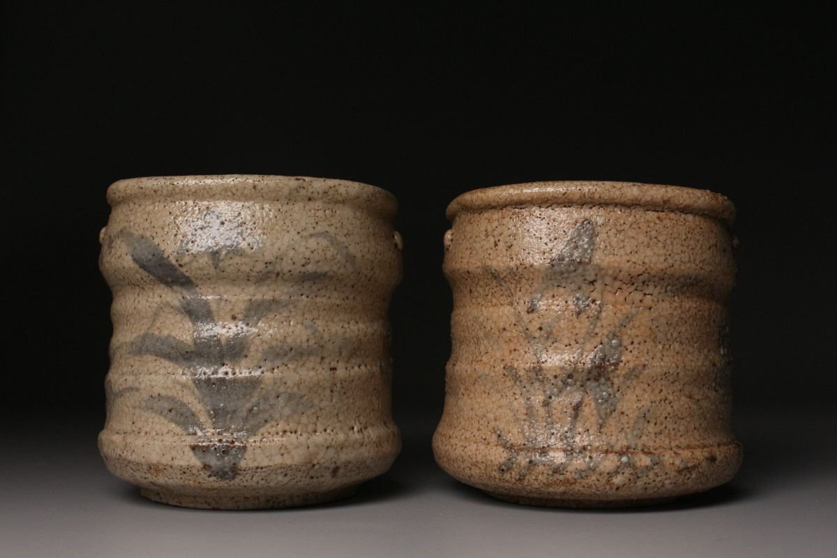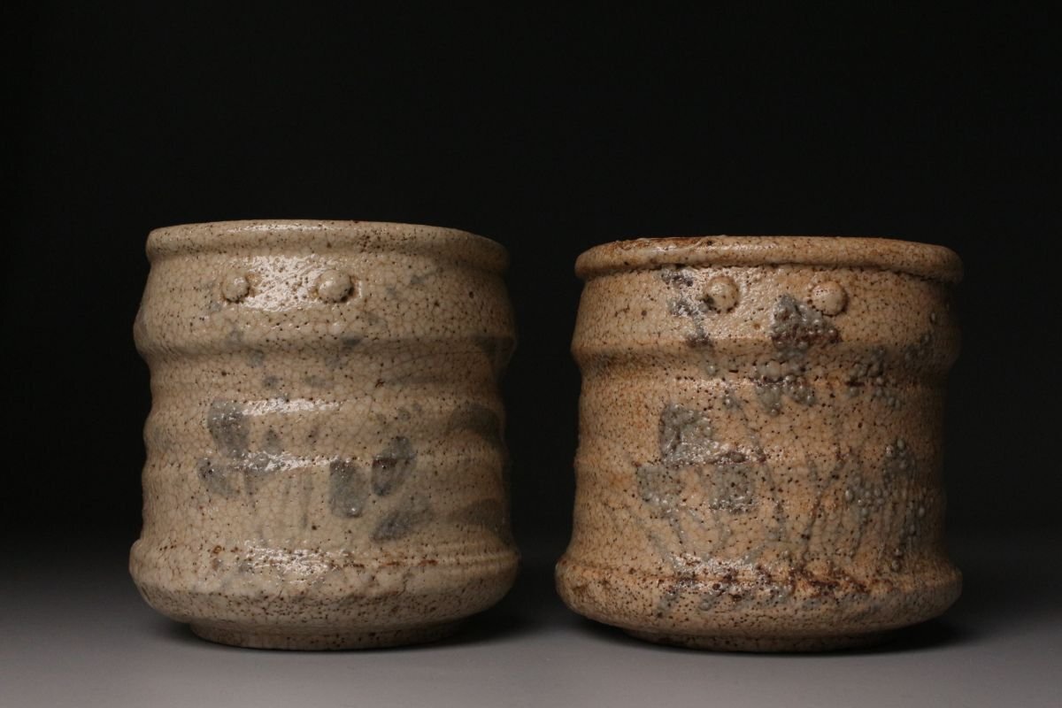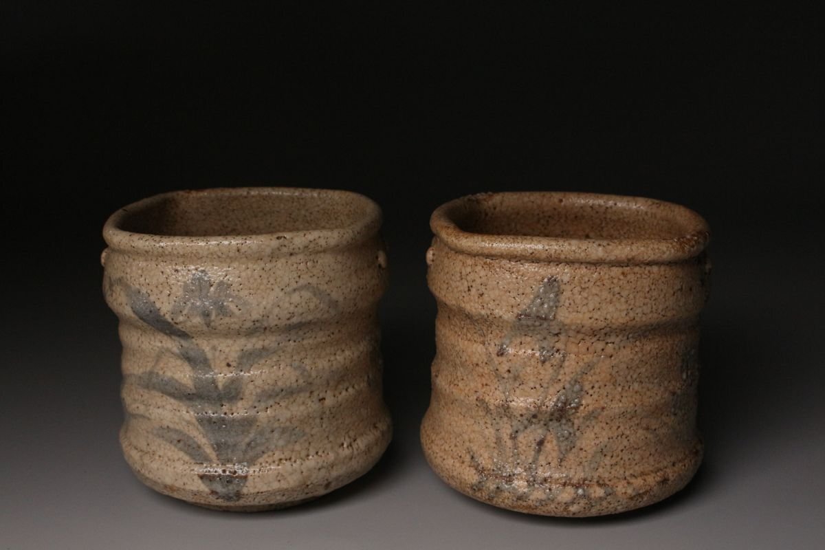[.WW]25.11 25110907A* * * 商品詳細 * * * ここでしか出逢うことのできない唯一の美をご紹介させて頂きます。 古志野の息遣いを映す、一対の筒向付。 柔らかな土味に鉄絵で描かれた草花文がそっと寄り添い、 志野特有の景色と相まって、静かな詩情を漂わせます。 一方は赤みを帯びた温かな古志野、 もう一方は白乳色にやわらかく霞む志野。 対を成すことで、それぞれの色合いが際立ち、 古志野が持つ多彩な表情を素直に味わうことができます。 鉄絵の草花文は素朴でありながら生命力に満ち、 焼成によって生まれた景色が土の息吹を感じさせ、 古陶の自由な精神をそのまま伝えるかのようです。 二つの器が響き合う静かな品格―― 古志野ならではの奥ゆかしさと温もりを、 どうぞお手元でじっくりとご堪能ください。 ■商品内容/ 火入2点、箱 ■サイズ/横9.5㎝×高10㎝ 箱:横23.5㎝×高13.5㎝×奥行12㎝ ■状態/経年による スレ、小傷、汚れ 箱にスレ、傷、汚れ、蓋の桟の直しがございます。 ※写真にてご確認、ご了承の上ご入札下さい。