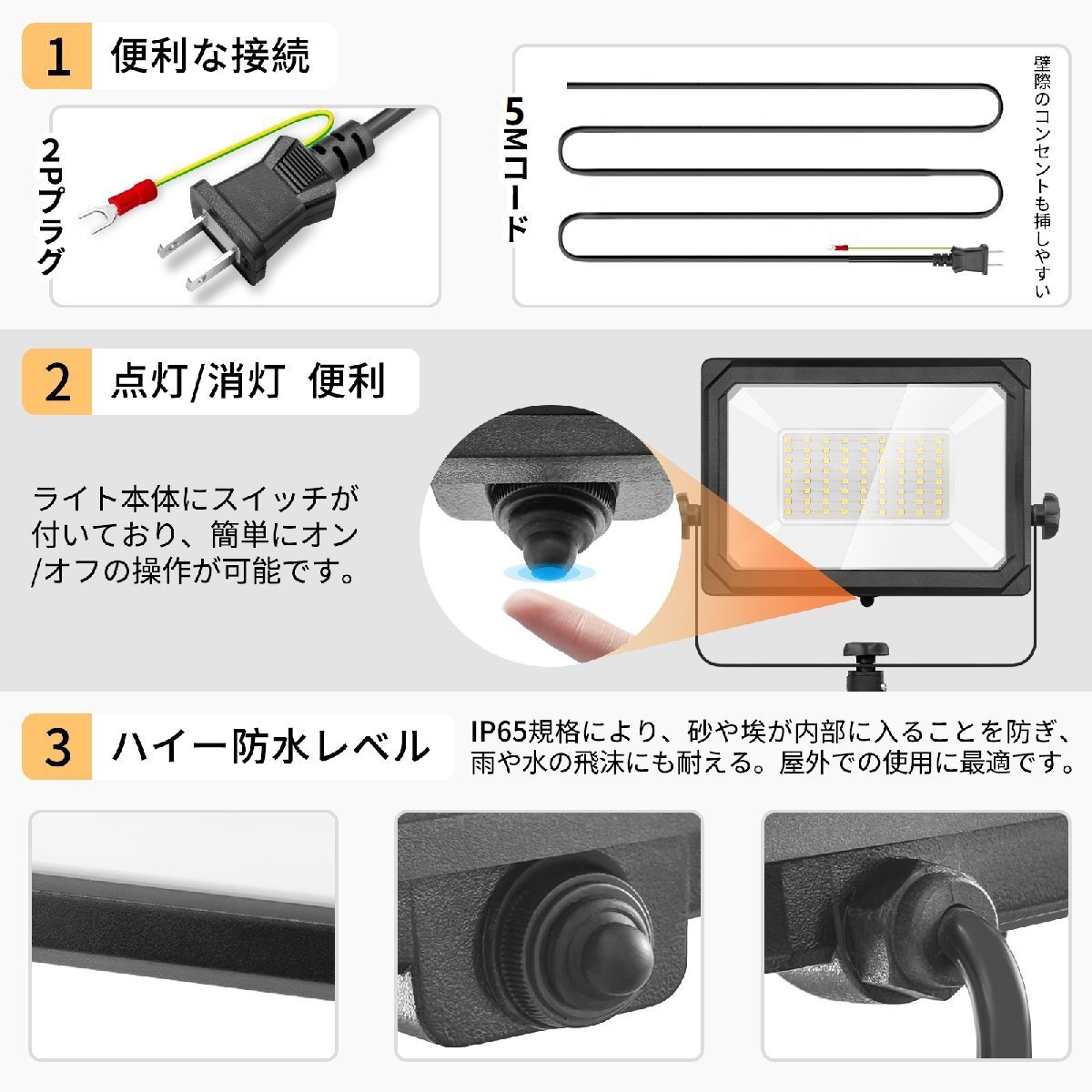 上質チップを搭載!高輝度・長寿命・省エネ、しかも、照射角度ご自由に調整できます! ◆高輝度のCOBチップの採用: 上質LEDチップを搭載して、他の投光器ライトより明るく照明効果を提供します。 ◆スイッチ: 防水スイッチ付きまして電源ON/OFF簡単切替可能で便利さアップ! ◆携帯しやすい: 携帯式ライトは小さくて軽くて持ちやすいです。取り付け用の道具は一切なし!どこにも使用できます。 ◆優れたダイカストアルミを採用: 優れたダイカストアルミを採用します。耐摩耗性防水設計などの特典をもって一体型の品質保証します。 ◆カバーは強化ガラス: 普通のガラスの4~5倍の強度を持つ強化ガラスを採用、光線の透過率は大幅アップします。透過率は98%以上に達する! ◆放熱性のいいアルミ合金: アルマイト処理のアルミ採用することで、放熱性を更なる段階に引き上げ!耐熱範囲内の正常な働きを保ちます。 ◆角度調整可能: ライトは柔軟な角度調整機能を持ってます。使い方も非常にカンタン! 下向き照射可:水辺また上向きの照射はもちろん、下方向にも向けられ、足元がはっきり見える。作業時に照明方法は自由に調整できます。 ◆驚きの長寿命: 本製品は100000時間以上の長寿命で、他の商品の2000時間を遥かに凌駕します。 ◆ファッションの設計: アルミ合金のボディ、グレーの外観は高級感が持ってます。 ◆広い使用範囲: トンネル、掲示板、ガソリンスタンド、夜間作業、現場工事、駐車場、公園、運動場にも様々な場所で活躍します!公園、運動、屋外や現場作業にも便利です!特に、夕暮れ時夜間作業にとても役立ちます! 虫が集まりにくいの も魅力です。 【保証】 ◆当商品は12っヶ月保証となります。 ◆お届けから1週間以内にご連絡のあった不良品の保証対応の送料は当方が負担いたします。 ◆保証期間内の不良品ですが、交換のみ対応しております。往復送料はお客様負担となります。在庫がない時だけ返金しますので、ご了承ください。 |