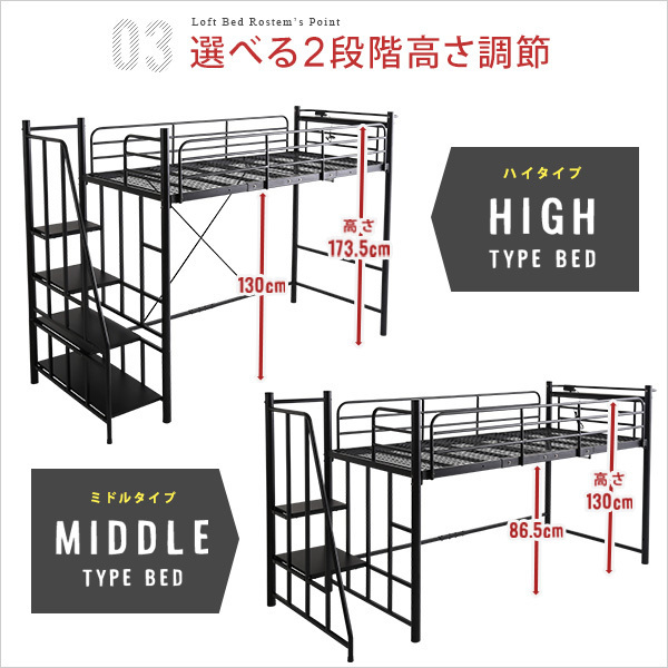 | 【ポイント】 ①収納スペース付きの昇り降りがしやすい階段付きロフトベッドです。 ②左右どちらでも設置可能な、宮棚&左右スライド式の2口コンセント付きです。 ③2段階の高さ調節(ハイ・ミドル)が可能です。 ④左右入れ替え可能な、衣類収納に便利なハンガーパイプ1本付きです。 |