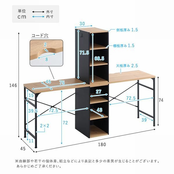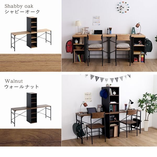 子供が成長してもずっと使えるヴィンテージツインデスク! いろいろな組み換えができる仕様になっております。 天板連結パターンにすると2人仲良く勉強や相談ができます。 ラックのサイドはフックが付いており、ランドセルやカバンを掛けることができます。 天板上部にはコードを通す穴が開いているので便利です。 高さ調整ができるラック棚には教科書や小物を収納できます。 天板幅は90cmあるので、広々お使い頂けます。 |