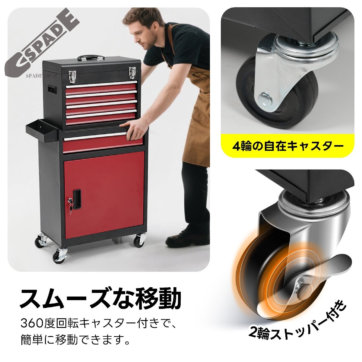• ◎02【作業が快適に進む収納力】5段の引き出しと扉付き収納で、よく使う工具をすっきり整理できます。【4段チエスト】4段&上部収納スペース【ローラーキャビネット】1段&鍵付きのキャビネット