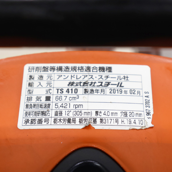 ■メーカー : STIHL(スチール) ■型 式 : TS410 ■全 長 [mm] : 675 ■質 量 [kg] : 9.5 ■ブレード直径 [mm] : 300 ■最大切込み深さ [mm] : 100 ■排気量 [cc] : 66.7 ■出 力 [kW] : 3.2 ■使用燃料油 : 混合ガソリン ■燃料タンク容量 [L] : 0.71 ■メーカー希望価格 : ¥226,000(税別) |