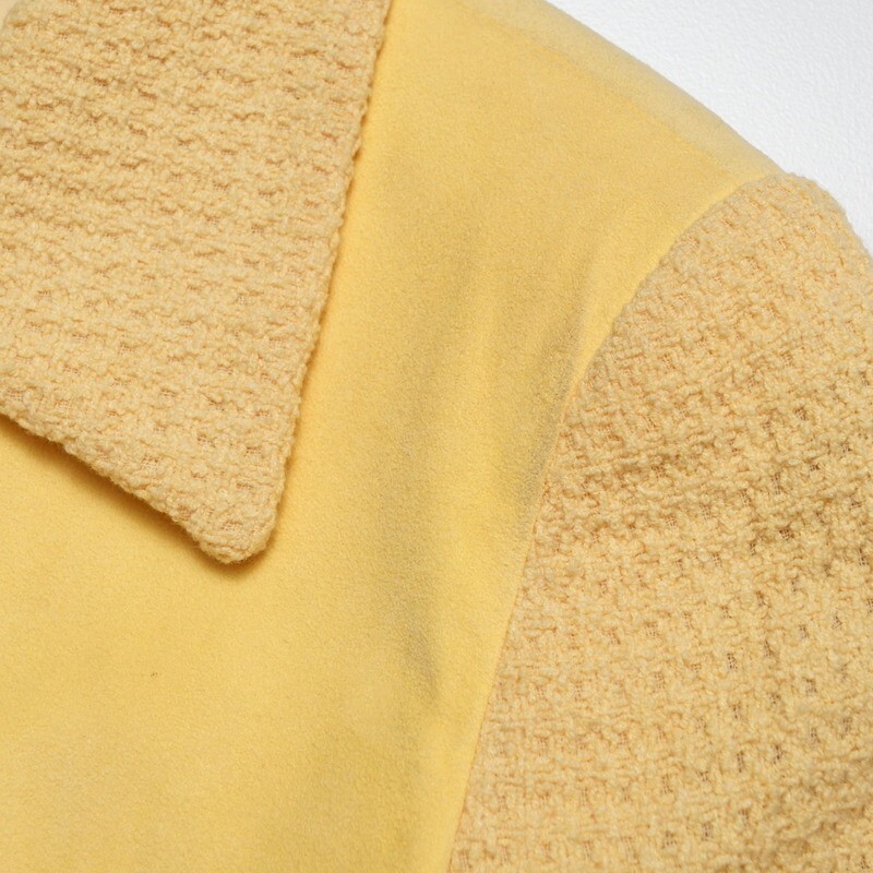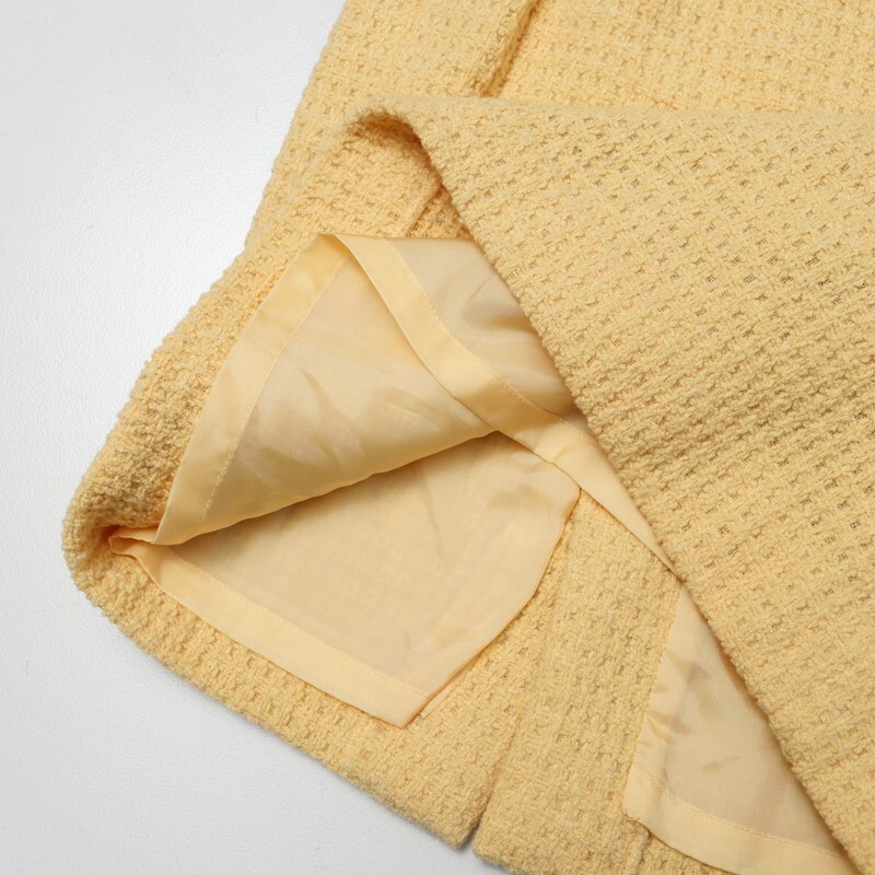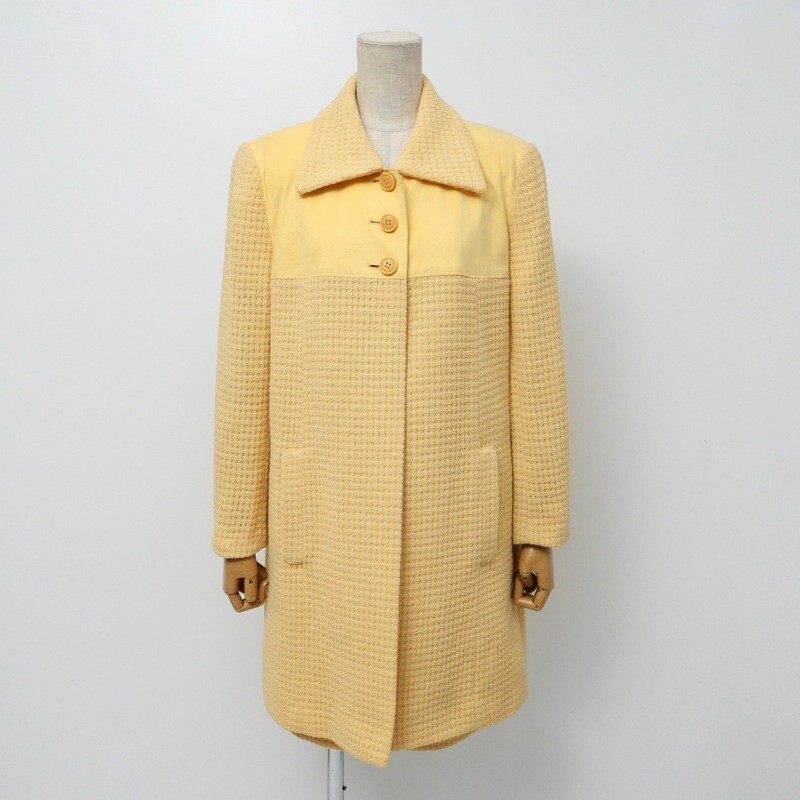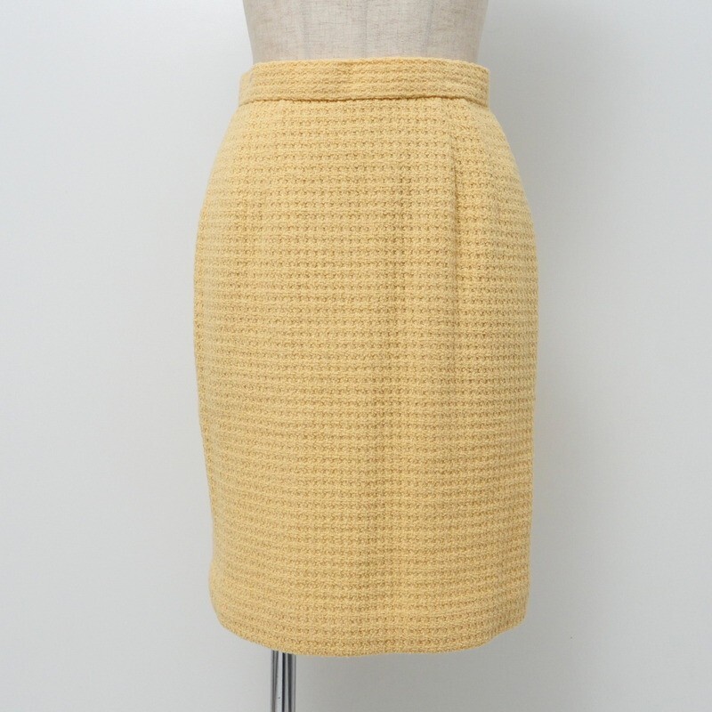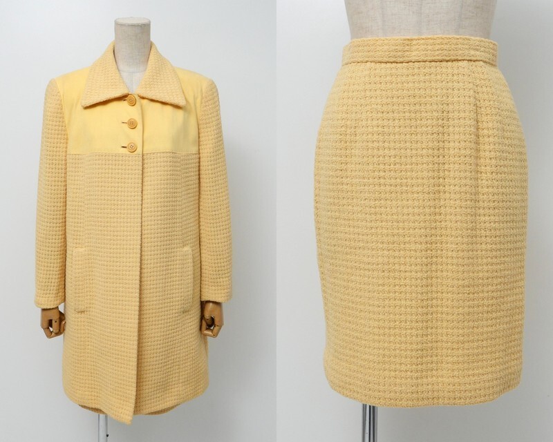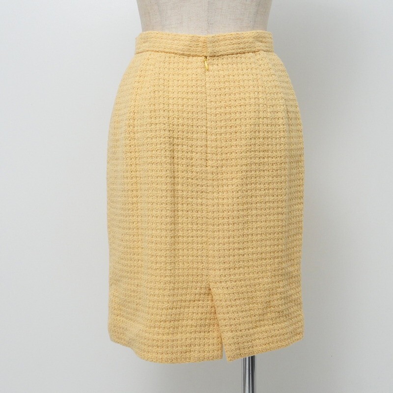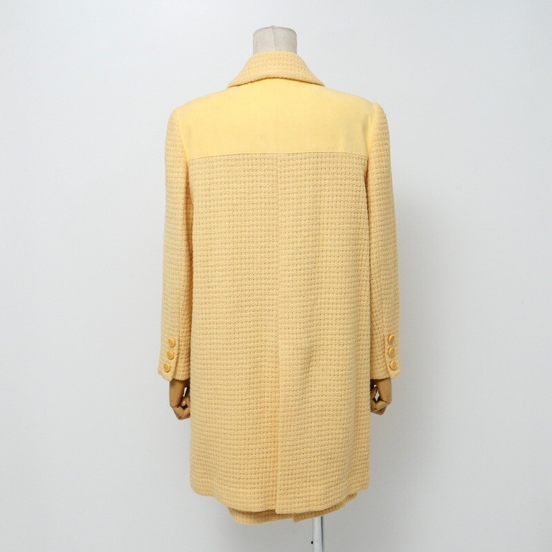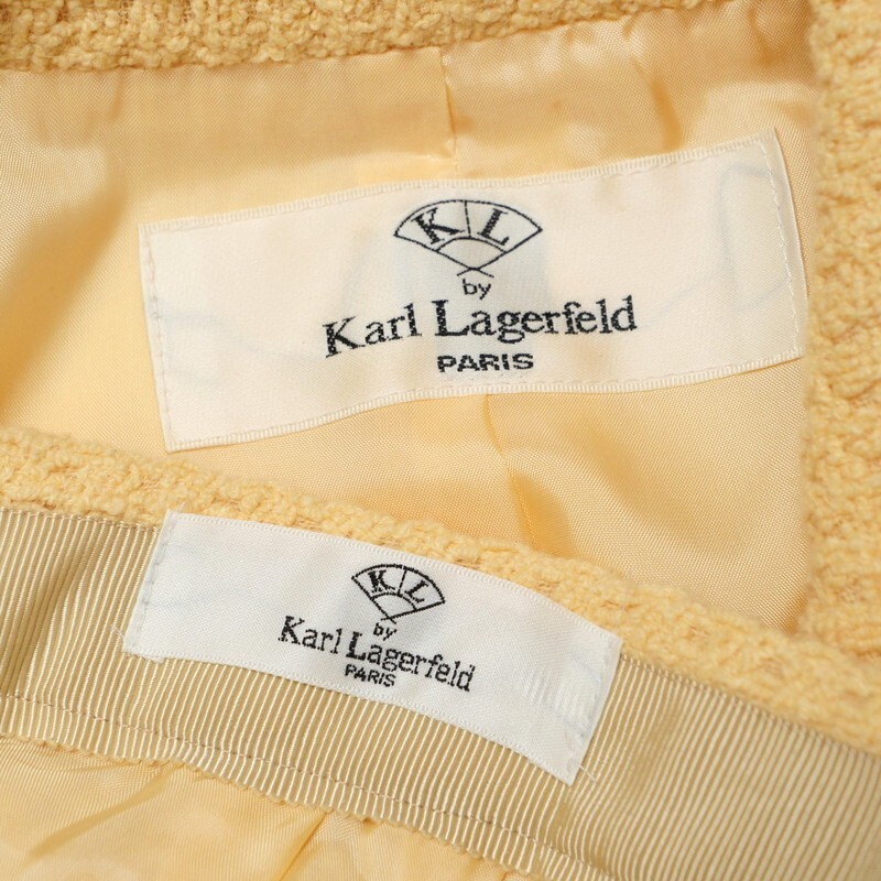 | TJ6839★カールラガーフェルド ツイード地 部分:エコスエードレザー ロング丈ジャケット 膝丈スカート セットアップ スーツ イエロー 38 | |||