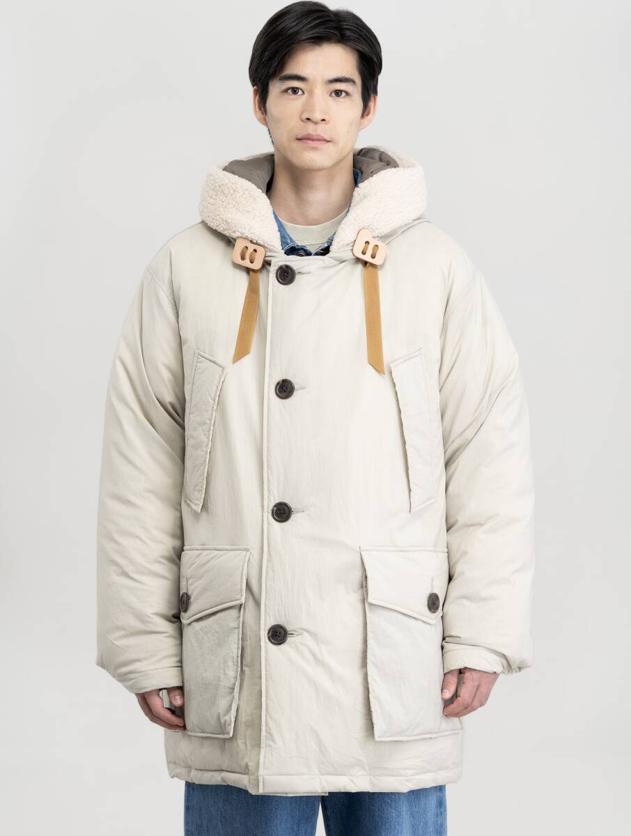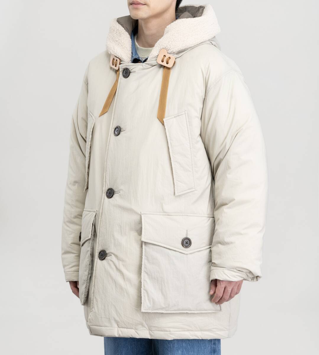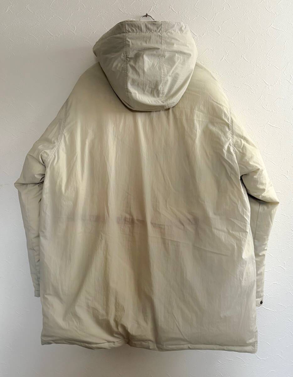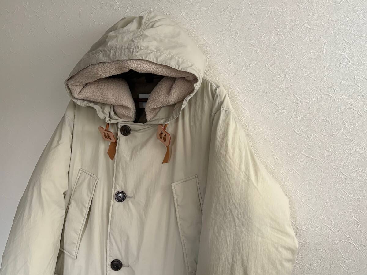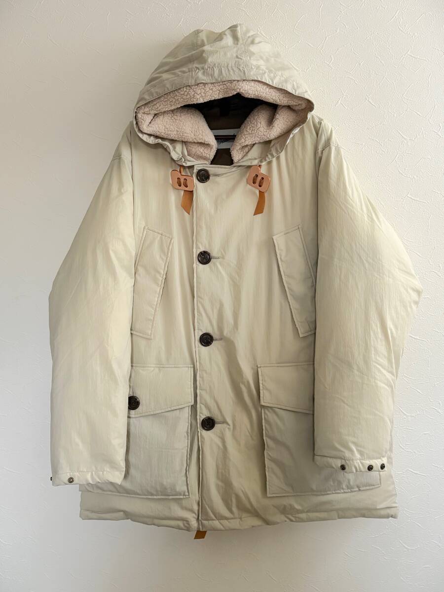 ご興味頂き、誠にありがとうございます。 他にも出品にしておりますので是非ご覧になってください。 【サイズ】 Lサイズ 着丈:90cm 肩幅:57cm 身幅:75cm 袖丈:66cm 男女兼用のユニセックスサイズになります。 ※素人採寸のため誤差はご了承ください。 【混率】 本体: 表地 ナイロン 92% ポリウレタン 8% 裏地 ナイロン 100% フード: 表地 ナイロン 100% 裏地 ナイロン 100% 中わた: ダウン 90% フェザー 10% 毛皮部分: ポリエステル 100% 皮革部分: 牛革 【定価】 ¥99,000(税込) 【状態】 新品(未使用品) 【商品説明】 SOFTSHELL LIGHT ARCTIC PARKA 通常の 60/40 クロスとは逆の柔らかくストレッチの効いた素材の アークティックパーカ。 軽さやコンパクトさが出せるようパーツも調整しています。 フードはフード縁にチューブ型にダウンを入れることで、 フード着用時のフィット感が増す設計になっています。 首元には羊型のブタバナがアクセントになっています。 ヌメ革の特有の経年変化も楽しめます。 肌触りのよい、ストレッチナイロンタフタを使用。 経糸は 70D のナイロンを使用しているため、 適度なハリコシがありながら、 緯糸にナイロンポリウレタンを 使用しているため肌触りがよく、 しっとりとした肌ざわり。 ヴィンテージ加工によるナチュラルなシワ感と、糸質による 少し艶のある表面は、 カジュアルさとエレガントさを兼ね備えた、 上品な表情を持っています。 クリーム色のダウンジャケット、フリース裏地付きで暖かい。 - 色: クリーム色 - フード: 取り外し可能なフード - ポケット: 前面に大きなポケットが2つ - ボタン: 前面にボタン留め - 裏地: フリース素材の裏地 - デザイン: シンプルなデザイン - 素材: ナイロンまたはポリエステルの外装 ご覧いただきありがとうございます。 カラー...ホワイト系 素材(詰め物)...ダウン