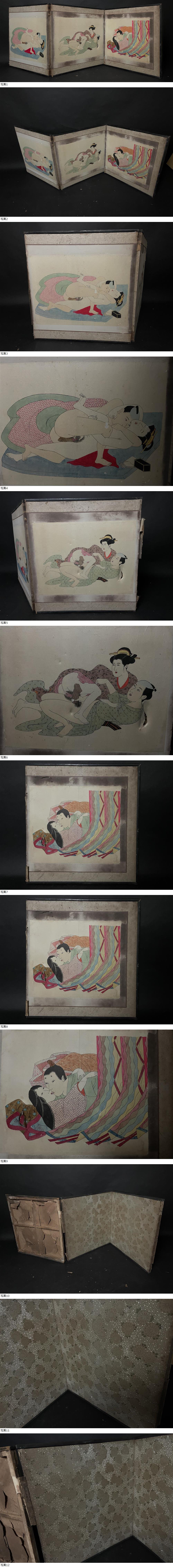 | 【真作】 時代 枕絵屏風 春画 浮世絵 紙本 三枚 日本画 版画 無落款 明治期 |