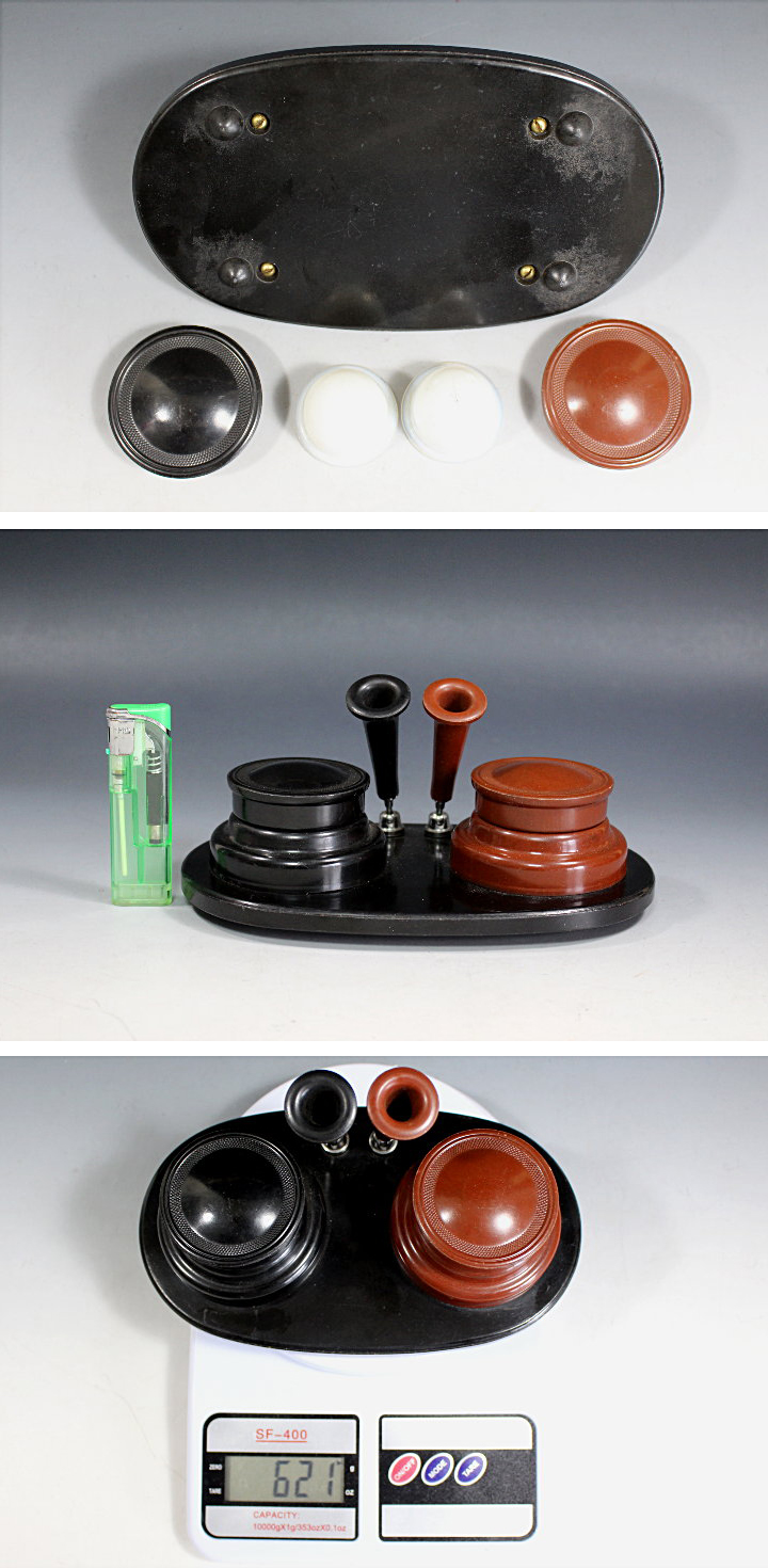 サイズ:底巾18.6cm 古い卓上ペンスタンドです。 時代はありますが状態はいい方だと思います。 箱はありません。 古い紙箱に入っていました。 写真をご覧の上ご入札宜しくお願い致します。 | |