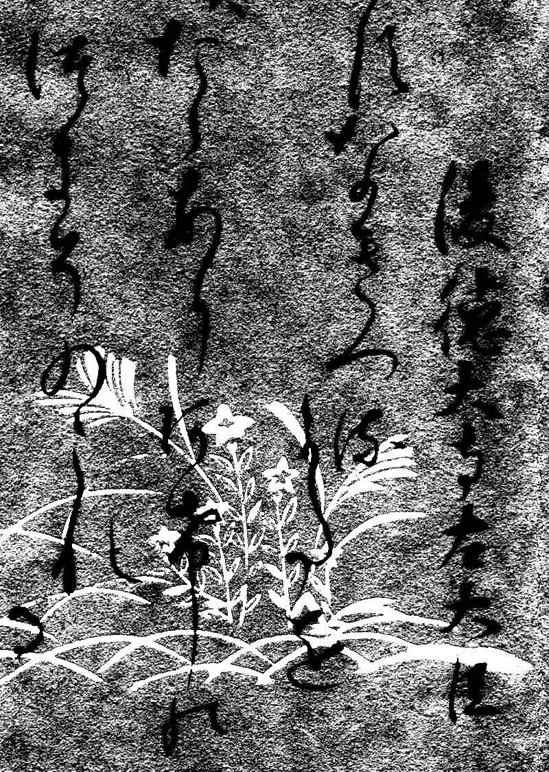 伊達孝子(たかこ)の和歌は「ちらし書」と呼ばれる書法です。文字を散らして布置するわが国独自の書き方です。この書法の歴史は平安時代の康保3年(967)の「紙背仮名消息」(滋賀・石山寺)、同じく平安時代の公卿・藤原公任(きんとう)自筆『北山抄』「仮名消息」(京都国立博物館)が知られております。各行に高低の変化をつけ、流暢(りゅうちょう)に続く連綿はきわめて美しいもので「百人一首」の書法として平安時代の公卿卿などの間で広まり、その後大名家の姫君の間で用いられておりました。