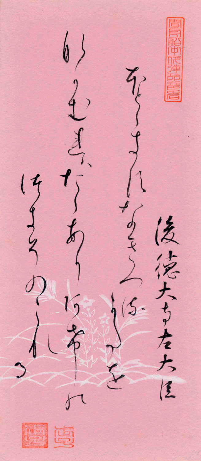 原本自筆上部には、「舟船(しゅうせん)の中に夜、琵琶を弾く者を聞く」《舟の中から夜、琵琶を奏でているのが聞こえてきた。》白楽天の元和十年(815年)江州での作。琵琶行という有名な漢詩。この漢詩は白楽天が司馬に左遷された翌年、客人を河口に見送ったおり舟の中から夜、琵琶を奏でる音が聞こえた。その音色は都会の音色である。弾いている人を尋ねてみると昔、長安の女性で琵琶の名人に学んだという。弾き終わったと、若い時の楽しかったことを語り合った。筆者の伊達孝子(たかこ)は、御三家のひとつ、江戸時代後期の大名で常陸国水戸藩の第9代藩主徳川斉昭の娘。伊達孝子(たかこ)は、八代姫(やしろひめ)として当時の徳川美人三姉妹の次女ともてはやされた。仙台藩第13代藩主・伊達慶邦の夫人として嫁いだ後も八代姫(やしろひめ)と称された。孝子(たかこ)は、和歌や漢詩の素養もある教養のある女性として知られておりますが、「百人一首」を記す際、漢詩を読み理解し共鳴していることがよくわかる。詳細な理由は下記説明欄に記載。