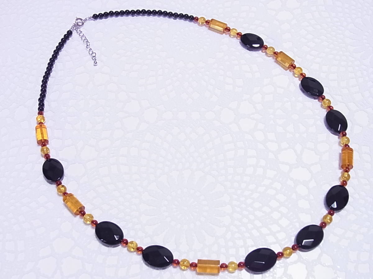 【数量限定販売になります】 使用石 : 天然ブラック・カルセドニー(染色処理) 約18×13mm オーバル(カット):平べったい形状です 4mm 天然琥珀(加熱処理) 約12×7mm 6mm 4mm 長さ : 約60+5cm 重さ : 約28g 留め金 : 引き輪式 アジャスター約5cm 真鍮製(ロジウム・コーティング) コーティングステンレスワイヤー使用 画像はサンプル画像ですが、サンプル画像と遜色のない商品をお送りします。 | |||