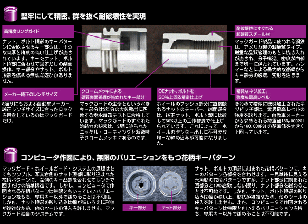 | 注意事項 | ■メーカー純正ホイールにはご使用いただけません。 ※スバル純正ホイールのテーパー60度のものはご使用いただけます。 ※当店のマックガードは万全なアフターサービスが受けられる日本仕様の正規品です。 |